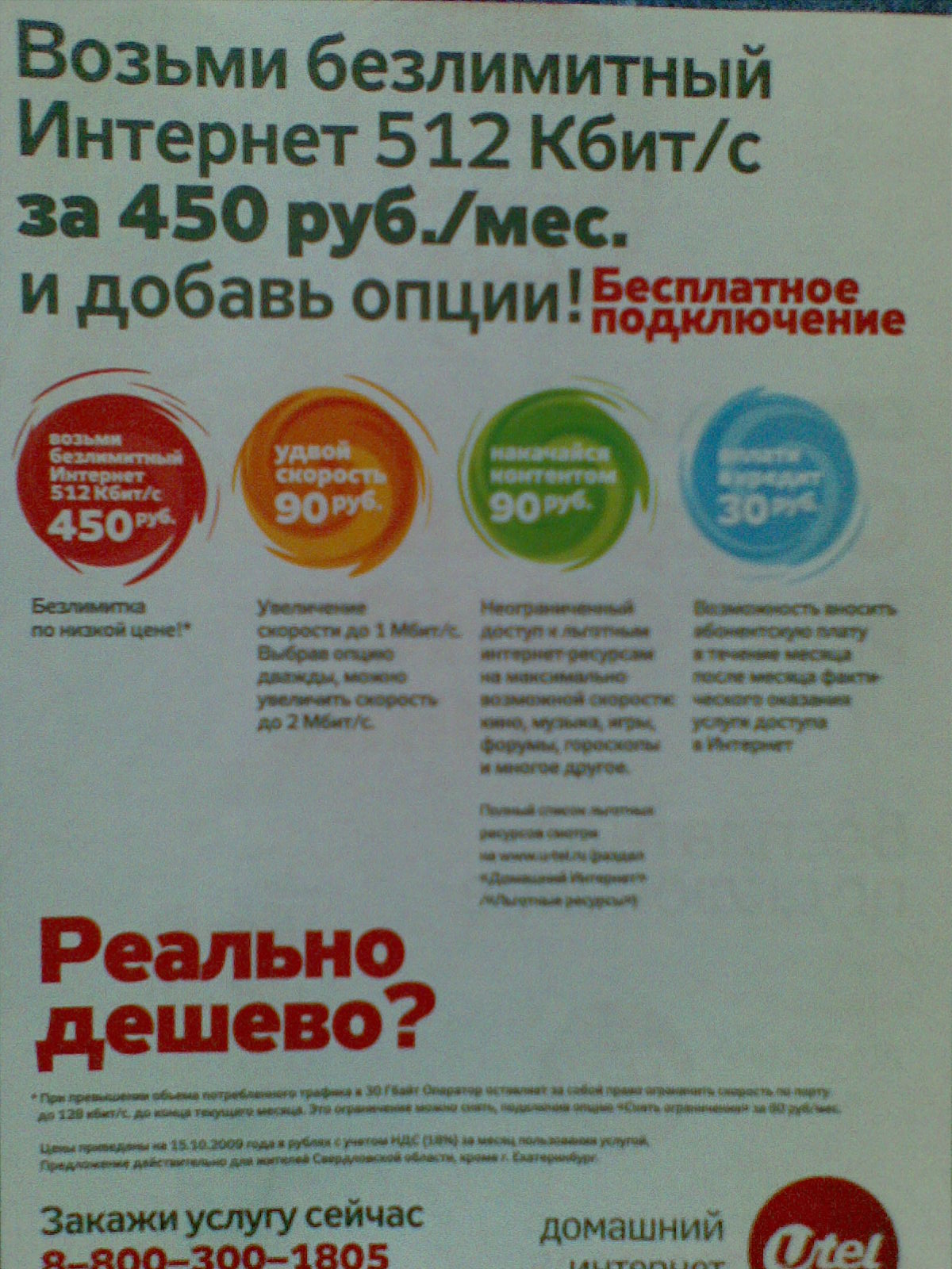 У ютела акция была(может и щас есть): для тех, кто сидит давно на ютеле, предлогают тариф "интернет микс" (вроде так называется), скорсть 2мбит/с (у меня 220-260кб\с держит) и всего 690р в месяц Друг подключается щас, дак у него мегабит будет стоить 850р -------------------- ![]() ![]() ![]() |