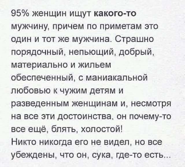 зачем столько сгуглинных буквей написанных и прочуствованных кем то..? можно было короче и своими словами, что именно вы думаете по этому поводу а не незнакомый дядька .. в связи с чем встречный вопрос к мужчинам - а когда вы себе картинку идеальной женщины рисуете то эпитет " должна" разве не используете ? дана у меня есть картинка идеальной женщины. вот глухонемая подслеповатая домовитая миловидная блондинка |