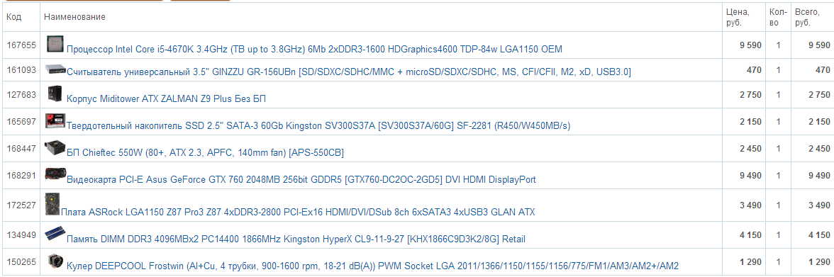 сэкономишь свои 5 тышь если материнку на другом чипсете возмешь, проц твой на 2 тыщщи дешевле, кулер другой возми у меня, в моем списке, материнка с таким чипсетом и процессор, выбраны для разгона если разгонять не собираешся, а судя по выбранному процессору, не собираешся, можно взять на корпусе можно чуточку сэкономить, памяти взять 4гб вместо 8 как у меня 172400 Плата ASUS LGA1150 H81M-C H81 2xDDR3-1600 PCI-Ex16 DVI, DSub 8ch 2xSATA 2xSATA3 2xUSB3 GLAN LPT mATX - 1 990 166233 Процессор Intel Core i5-4570 3.2GHz (TB up to 3.6GHz) 6Mb 2xDDR3-1600 HDGraphics4600 TDP-84w LGA1150 OEM - 7 790 126017 Кулер DEEPCOOL Tiger Shark (Al+Cu, 4 трубки, 500-1500 rpm, 18-28 dB(A)) PWM Socket LGA775, 1150, 1155, 1156, 1366 AM2, AM2+, AM3 - 990 142219 Память DIMM DDR3 2048MBx2 PC17000 2133MHz Kingston HyperX Intel XMP CL10-11-10-30 [KHX2133C10D3T1K2, 4GX] Retail - 2 990 вообщем как то так.. чтоб вписатся в бюджет |