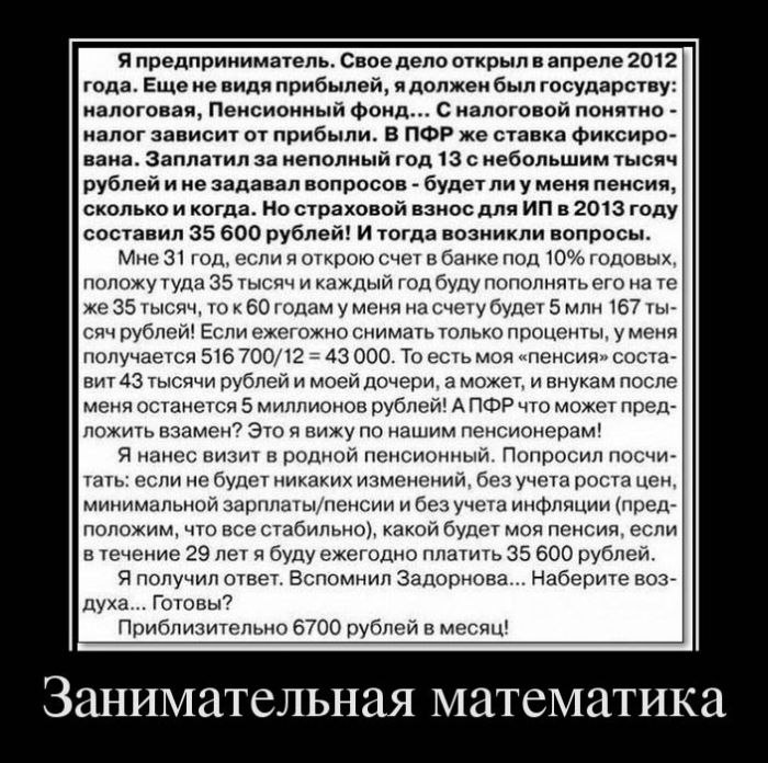 Президент Саркози: У нас зарплата 8000 евро в месяц, налоги, туда-сюда, на руки получают 7500 евро. На проживание надо 3000 евро. Куда девают остальные 4500, хрен их знает. Президент Обама: У нас зарплата 10000 долларов в месяц, налоги, туда-сюда, на руки получают 8500 долларов. На проживание надо 4000. Куда девают остальные 4500, хрен их знает. Президент Путин: У нас зарплата 6000 рублей в месяц, налоги, туда-сюда, на руки получают 5300 рублей. На проживание надо 15000. Откуда остальные 9700 берут, хрен их знает. |
