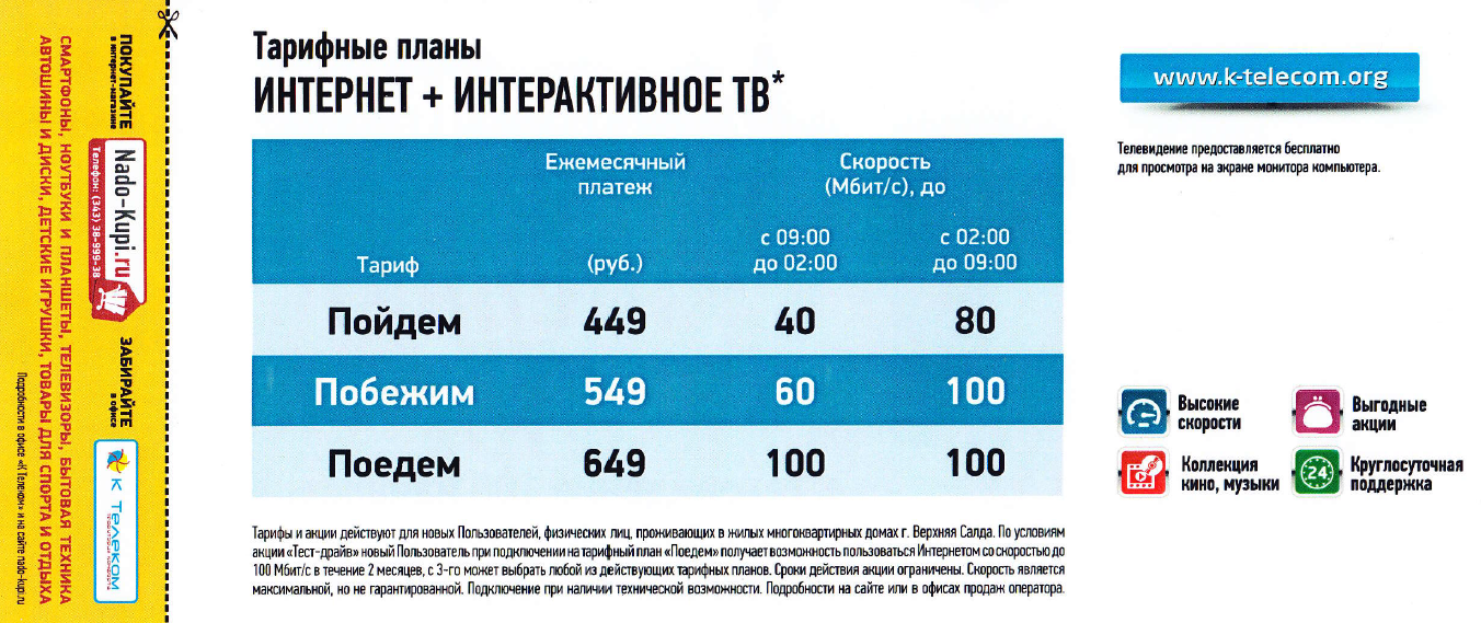 Уважаемые абоненты! У нас появились новые тарифные планы действующие с 1.02.2015 года. С новыми тарифами и акциями вы можете ознакомиться на официальном сайте К Телеком , по телефону (34345) 47-4-47 или в офисе оператора г. Верхняя Салда, ул. Энгельса 81/4. Обращаем ваше внимание, на то что переход со старого тарифа на новый производится бесплатно!