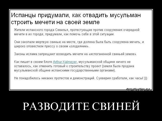 из просторов интернета... анекдот да и только, плюс юмористические демотиваторы... Цитата... http://www.e1.ru/talk/forum/read.php?f=67&...t=11098098& "Борьба с сектантами их же методами Автор: Салымон Дата: 29 Ноя 2012 09:52 В сегодняшней рассылке от anekdot.ru история: "... но сало надо перепрятать..." " Жители испанского города Севилья протестующие против сооружения очередной мечети в их городе придумали, как помочь себе в этой ситуации. Они закопали мертвую свинью на месте, где должна была быть сооружена мечеть, и широко оповестили прессу о своем ?злодеянии?. Законы ислама запрещают возводить мечети на ?испоганенной свиньей земле?. Как пишет в своем блоге Arthur Kalmeyer, мусульманской общине ничего не оставалось, как отменить готовый к строительству проект (земля была продана мусульманской общине испанскими государственными органами). Не понадобилось никаких протестов и демонстраций. Суеверия сработали, как часы! ))" Считаю, надо брать на вооружение... И это ... чего такого надо закопать у фонтана, чтобы РПЦ туда не посягало больше7 Или этим хоть ссы в глаза - всё: "божья роса"..."" надеюсь никто не воспринимает эти суеверия всерьез Сообщение отредактировал Malik - 6.1.2015, 4:10 |
