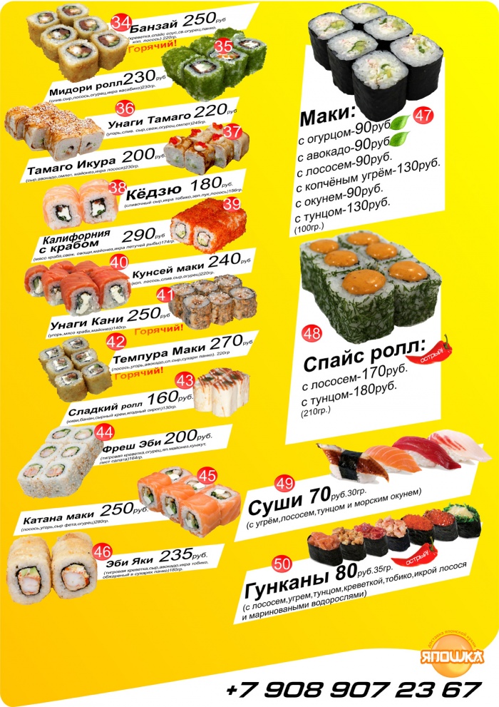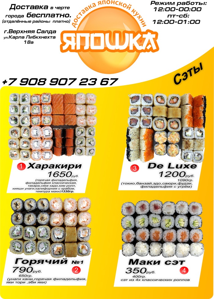 На вкус и цвет.... Нам вот япошка вообще не понравилась ну так тут и тема не о вкусах, а конкретно меню япошки спрашивают)) это как вы в магазин за ботинками пришли, а вам сапоги настойчиво предлагают, хотя вам нужны именно ботинки))) какая разница, что вам понравилось или нет - людям нужна япошка, если нужна будет альтернатива, то они сами найдут, тем более вариантов достаточно(помимо сушироллов есть ещё сирень, съешь сам, долина вкуса...) |