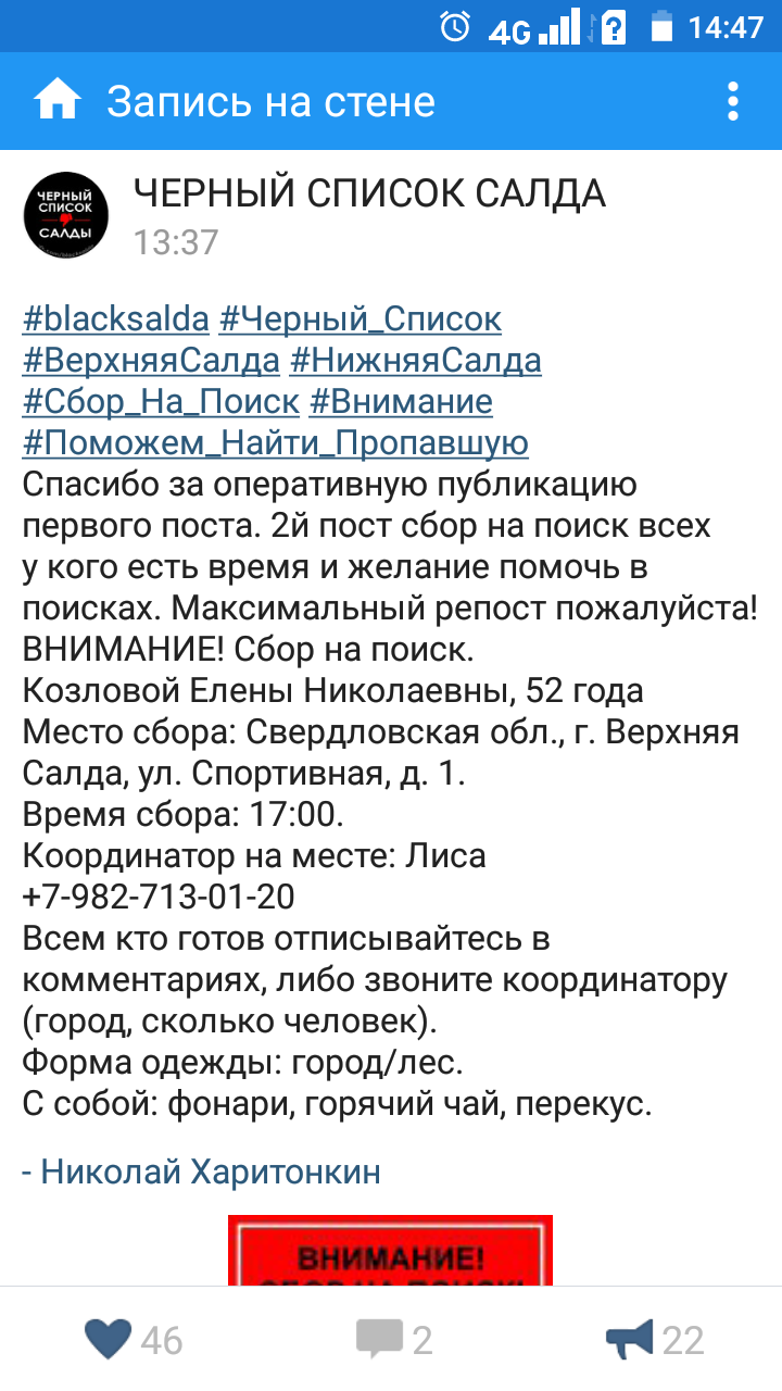 Почему все решили, что она ушла в лес? Там можно куда угодно уйти. На центральной странице написано, что информация про лес с камер видеонаблюдения. Вдоль обочин по старой нижнесалдинской проверяли? Нет следов дтп например? И неужели женщина ушла без мобильника? Какой номер её мобильного, если он у неё с собой был? Иногда смартфоном не получается дозвониться, а с кнопочного или раскладушки запросто, у них сигнал сильнее. Сообщение отредактировал ZloVredina - 13.2.2018, 15:37 |