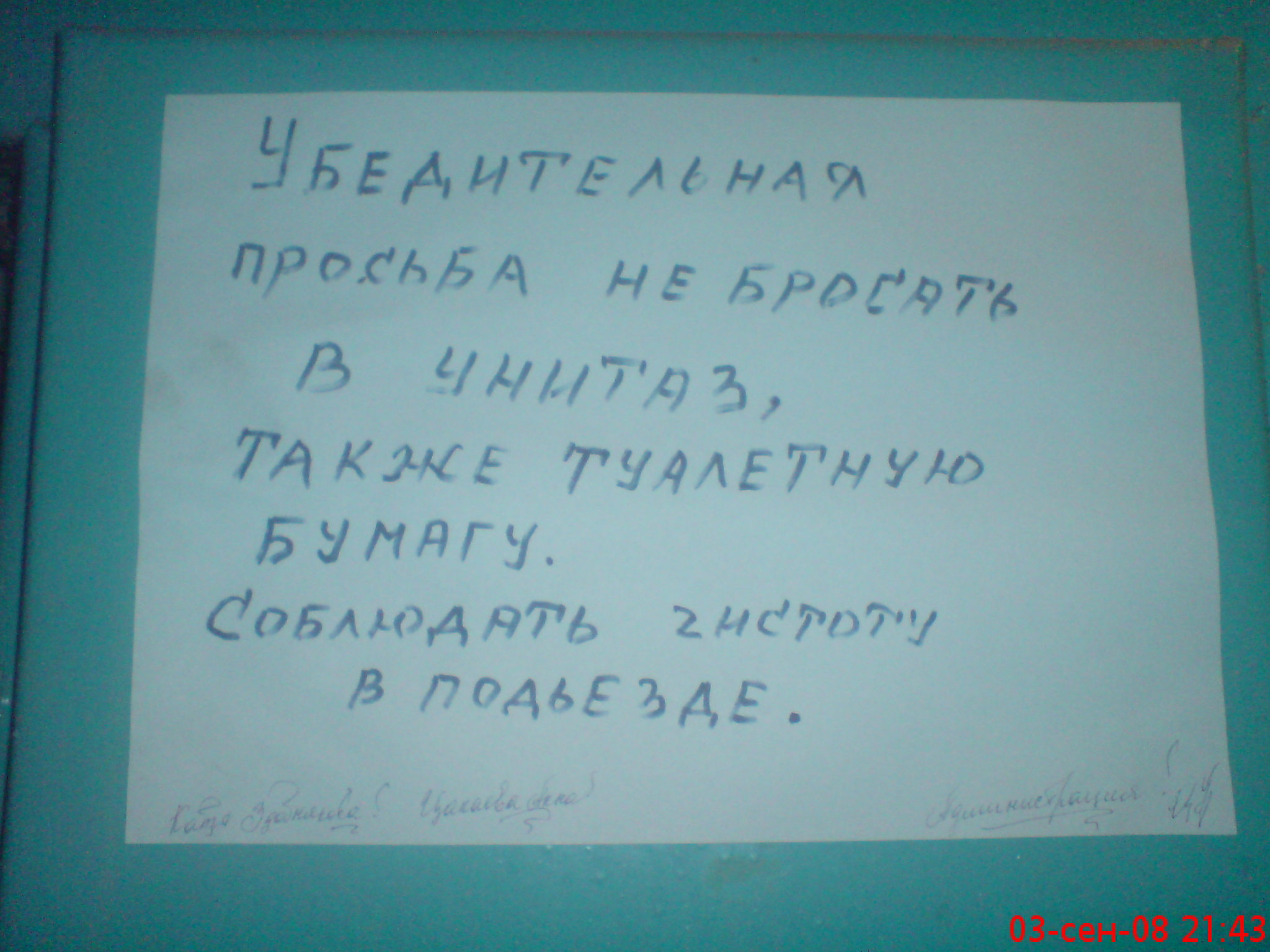 Что то может не в тему, но меня прикольнуло и я сфоткал))) Снимок сделан в центре города Орёл, за кинотеатром "Окрябрь" (Табличка) Надпись в подземном переходе на ларьке с DVD дисками (Лист на окне) Надпись в подъезде г. Н-Салда))) (Лист на щитке) Фото в магазине на ценнике в строке "наименование товара" (Момент-клей) Вход в Ночной клуб "RESPECT" г. Орёл (Знак) Фото сделано в м-не NIX г. Орёл, игра только вышла (Диск+2Гб оперативы...комплект))) Юмор Мед.Фака. (Черепушка) Фото Престижного ночного клуба "Xenon" г. Орёл (Трактор у входа) Балванка м-н Nix (Албанский диск) М-н Nix (Комп для проверки, тестирования отдельных комплектующих) М-н Nix (Почти фирменный чайник) Г.Орёл. окраина города.(Женское нижнее бельё, на палке, через дорогу от гипермаркет "Юнмарт") М-н Nix (Сервер тех. отдела) Сообщение отредактировал Мобильный взломщик - 28.3.2009, 6:20 -------------------- Дети! Не трогайте мокрыми руками оголённые провода! Они от этого ржавеют и портятся!