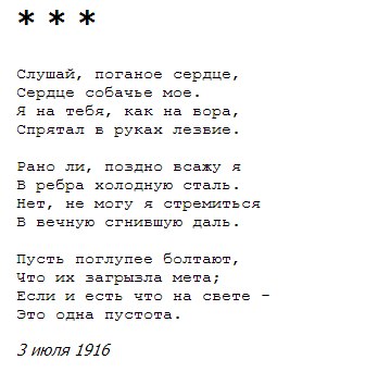 Сергей Есенин Слушай, поганое сердце, Сердце собачье мое. Я на тебя, как на вора, Спрятал в руках лезвие. Рано ли, поздно всажу я В ребра холодную сталь. Нет, не могу я стремиться В вечную сгнившую даль. Пусть поглупее болтают, Что их загрызла мета; Если и есть что на свете - Это одна пустота. -------------------- В мире нет вечных двигателей, вечных тормозов зато полно.
