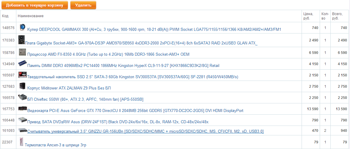 сэкономишь свои 5 тышь если материнку на другом чипсете возмешь, проц твой на 2 тыщщи дешевле, кулер другой возми у меня, в моем списке, материнка с таким чипсетом и процессор, выбраны для разгона если разгонять не собираешся, а судя по выбранному процессору, не собираешся, можно взять на корпусе можно чуточку сэкономить, памяти взять 4гб вместо 8 как у меня 172400 Плата ASUS LGA1150 H81M-C H81 2xDDR3-1600 PCI-Ex16 DVI, DSub 8ch 2xSATA 2xSATA3 2xUSB3 GLAN LPT mATX - 1 990 166233 Процессор Intel Core i5-4570 3.2GHz (TB up to 3.6GHz) 6Mb 2xDDR3-1600 HDGraphics4600 TDP-84w LGA1150 OEM - 7 790 126017 Кулер DEEPCOOL Tiger Shark (Al+Cu, 4 трубки, 500-1500 rpm, 18-28 dB(A)) PWM Socket LGA775, 1150, 1155, 1156, 1366 AM2, AM2+, AM3 - 990 142219 Память DIMM DDR3 2048MBx2 PC17000 2133MHz Kingston HyperX Intel XMP CL10-11-10-30 [KHX2133C10D3T1K2, 4GX] Retail - 2 990 вообщем как то так.. чтоб вписатся в бюджет |
