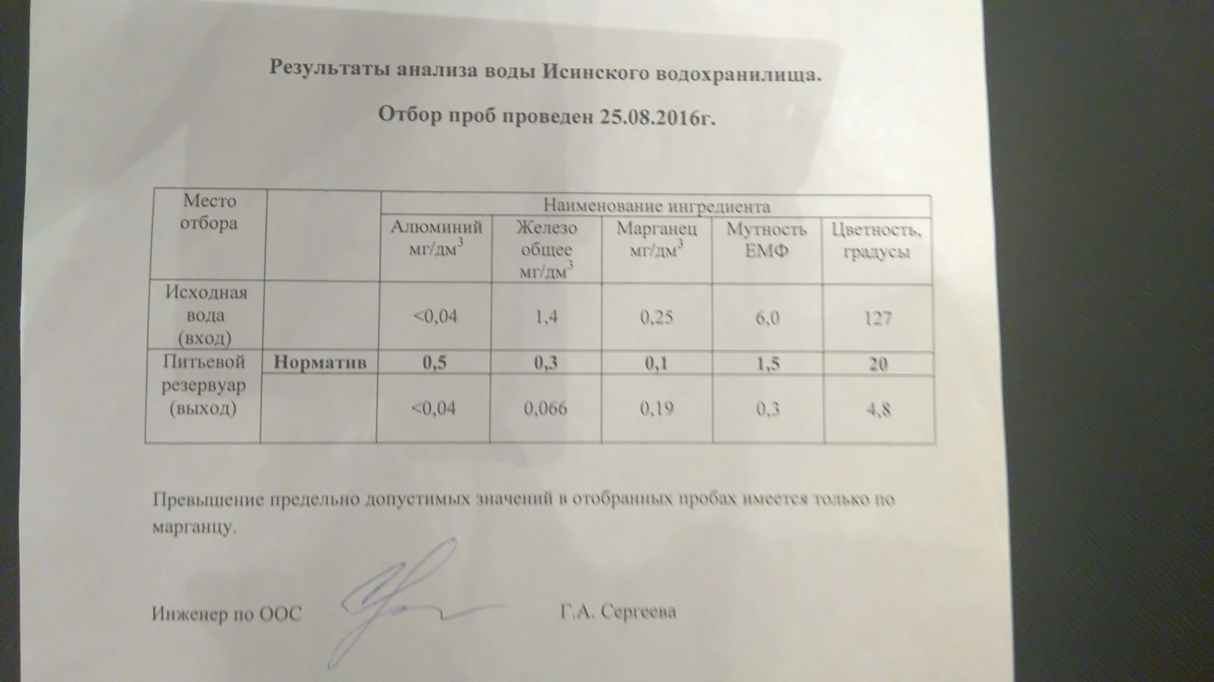 Результаты анализов пришли. Превышение показателей по марганцу, но это для нас не новость, почти постоянно этот показатель выше нормы, такова особенность местной воды. Роспотребнадзор берет пробы воды на исследование два раза в неделю (заключен договор) Лаборатория МУП "гор.УЖКХ" на фильтровальной станции, исследует воду ежедневно. Лабораторию с ВСМПО пригласили, для контроля, как третейского судью. Анализы с трех лабораторий в пределах нормы (кроме марганца) Пробы брали до запуска нового реагента. Новый реагент работает, вода стала гораздо чище. Запах никакой реагент не убирает, это только изменит похолодание. Что с экспертизой аоды, которую пооводило ВСМПО? Всё, замяли тему? Вода была непригодная для хоз.бытовых нужд? Результаты размещала 26.08.16г.