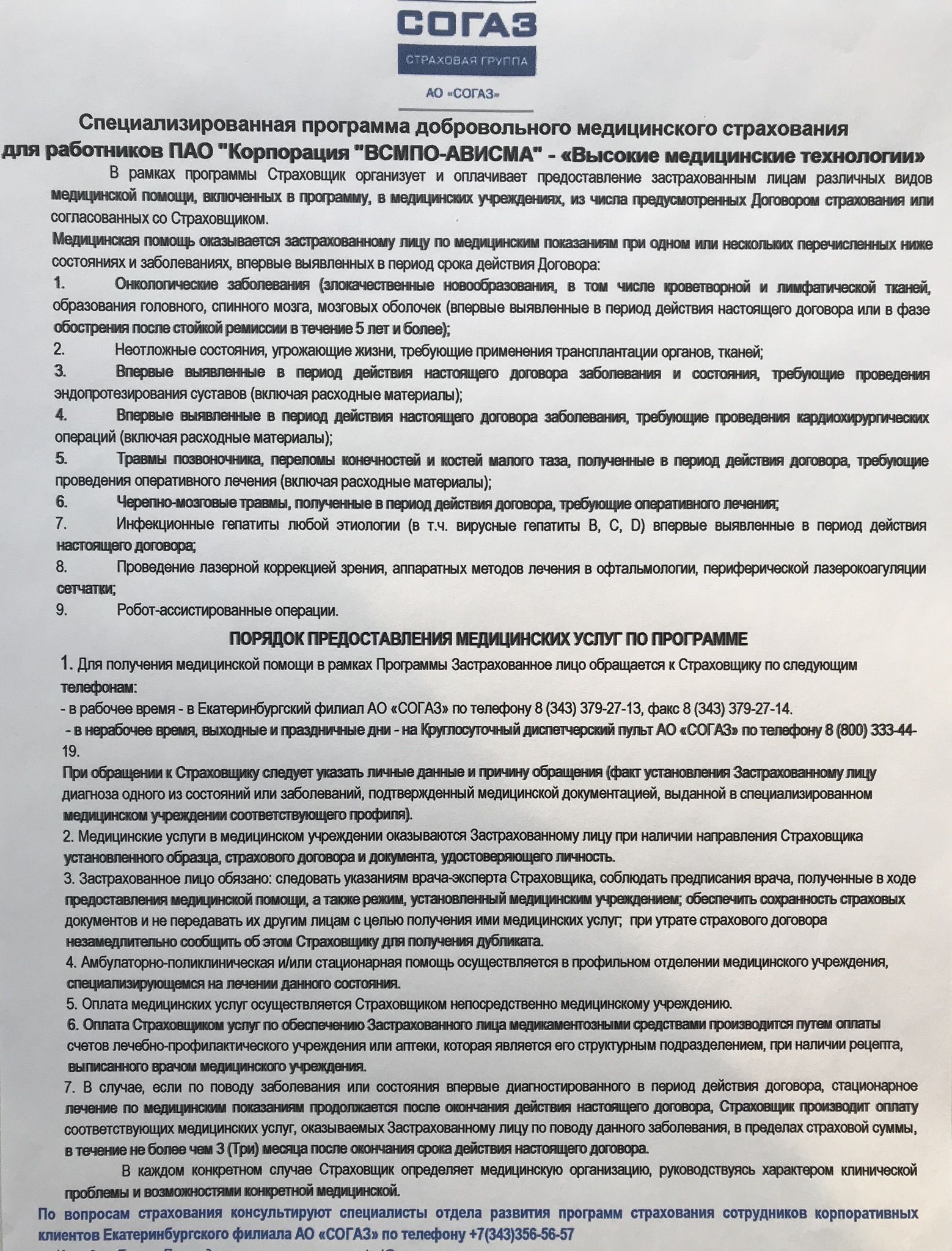 В каждом цехе есть уполномоченный по социальным вопросам, он занимается страхованием от Согаза. Застраховаться могут работники ВСМПО и члены их семей. 1500 руб - программа ДМС «Высокие медицинские технологии» 840 руб - страхование от несчасных случаев и болезни (входит энцефалит и болезнь Лайма) Также предусмотрена рассрочка платежа на 5 месяцев спасибо. |