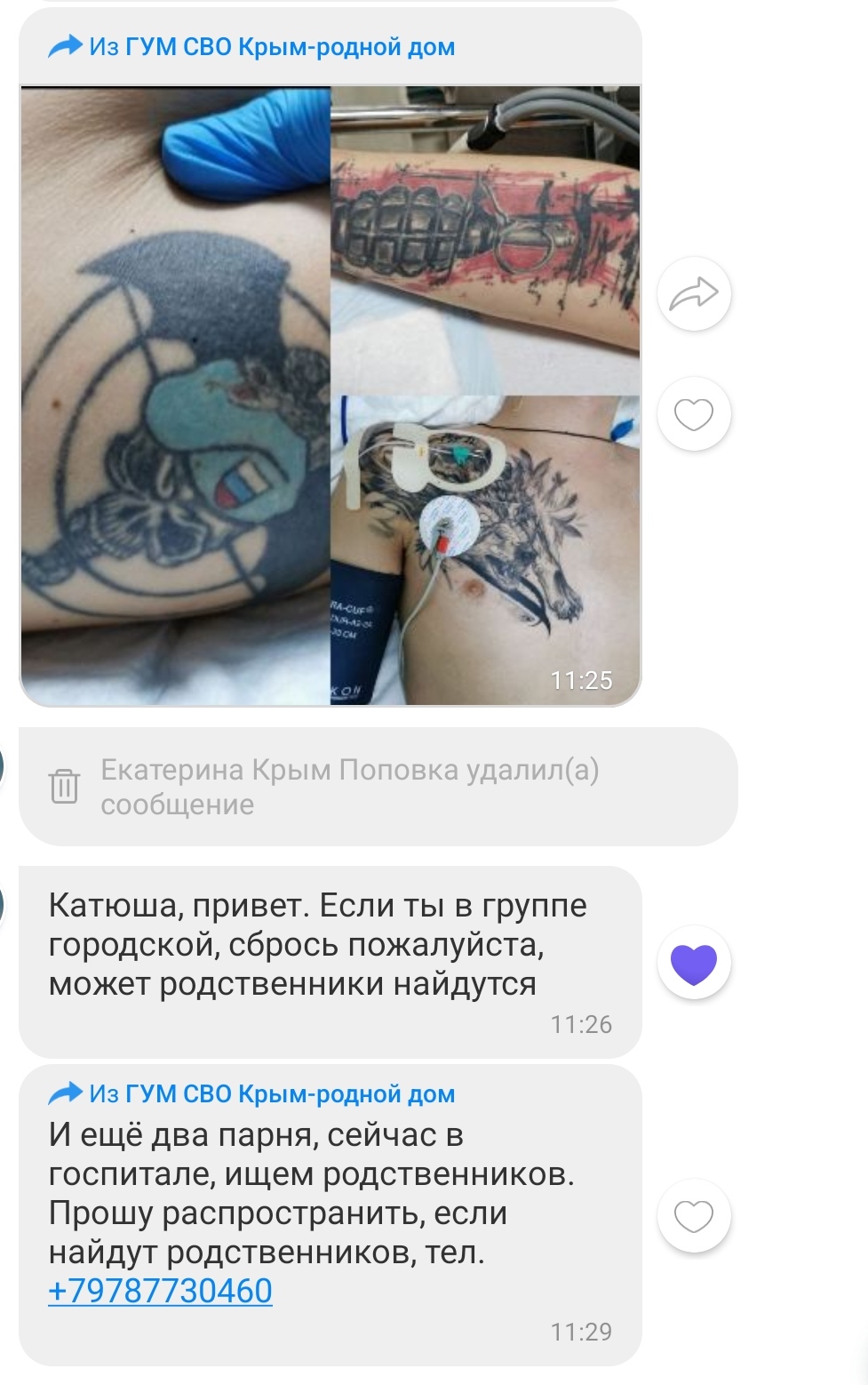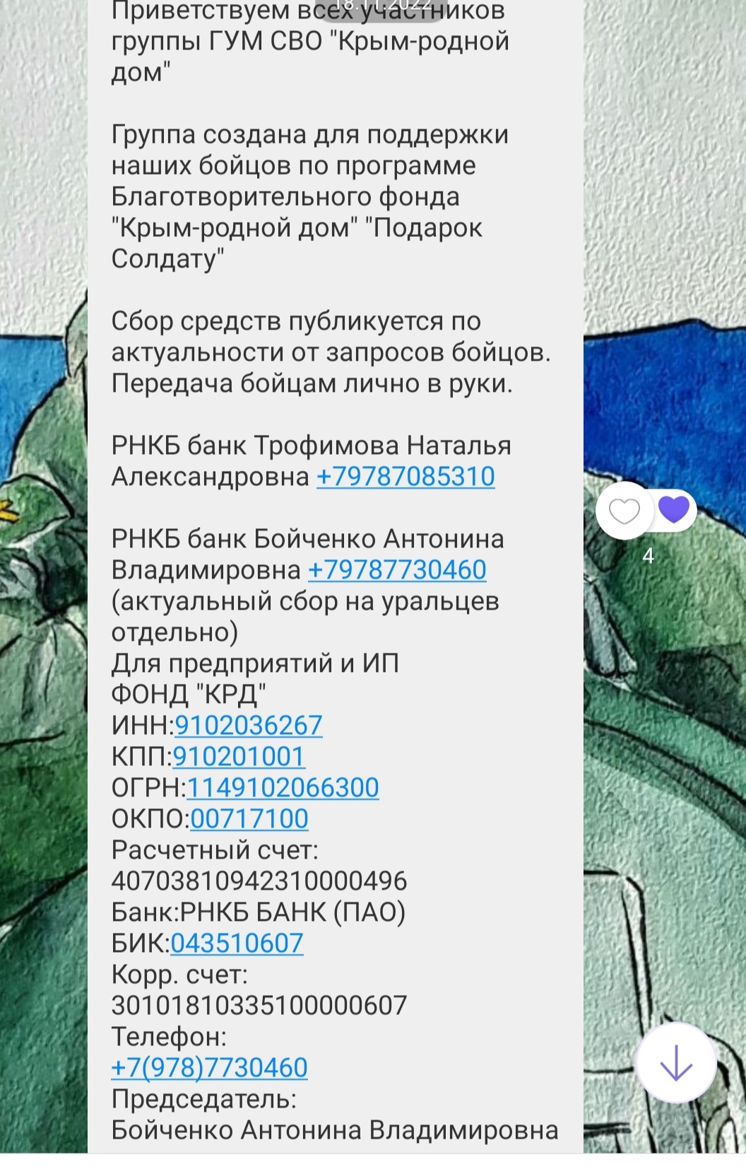 Доброе утро. Хочу поделиться информацией о группе, которая активно работает в Крыму в помощь нашим бойцам СВО. Это адресная помощь солдатам, у них есть возможность доставлять её прямо в руки. Ссылка в Вайбер https://invite.viber.com/?g2=AQBGFQ1AWyQQ%2...nM%2BwcBLtCDAGv Вступите, посмотрите люди реально работают. Кто хочет перевести в помощь можно перевести по номеру телефона, есть реквизиты для ИП. |