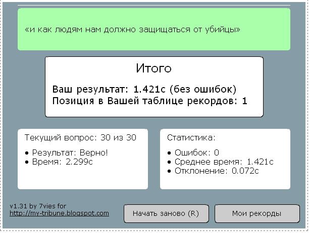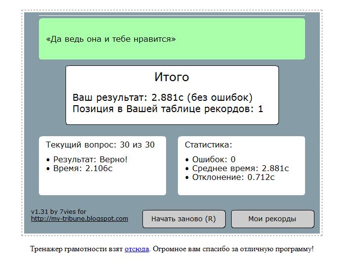 Итого Ваш результат: 2.515c (без ошибок) Позиция в Вашей таблице рекордов: 1 |