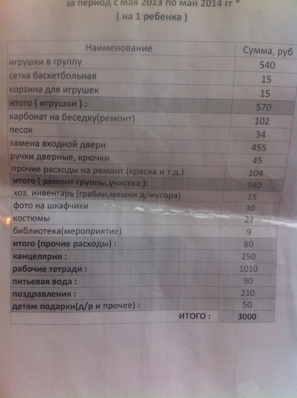Мы вот тоже из этого садика.. Я так понимаю это вывесил отче родит. комитет вам??? Или это уже сделано и нужно сдать деньги? если да тогда другой вопрос-на какие деньги это делалось и покупалось???? Как то странно Ну судя по датам вверху - уже за прошедший год. Ну так-то страшная сумма, чтобы разом отдать |