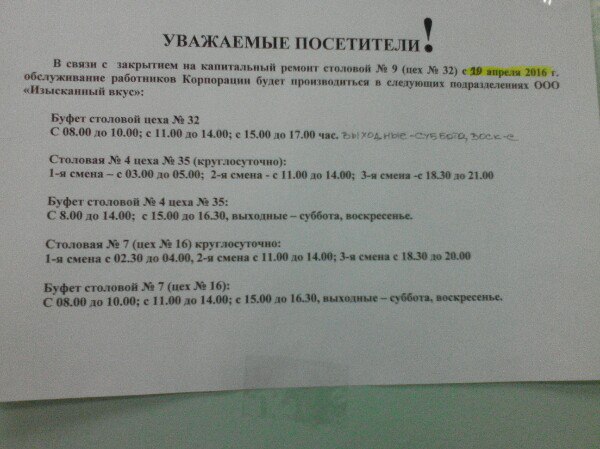 Сат Вы проверьте столовку в 16 цехе, они там в перерыв... 21.4.2016, 22:09