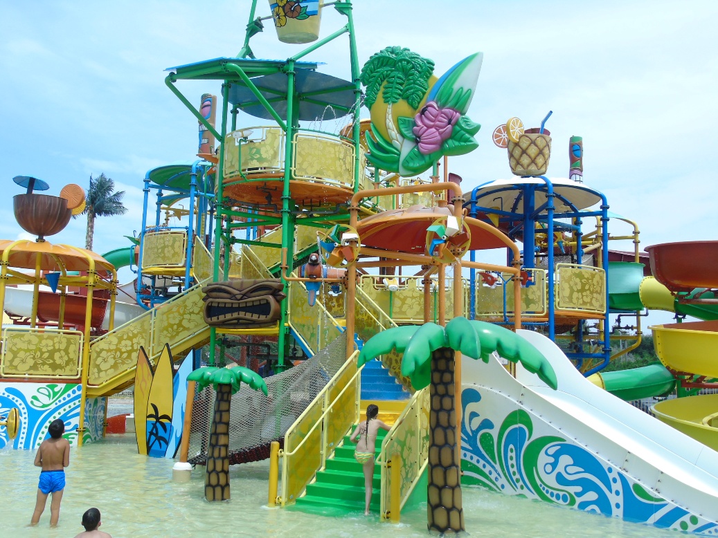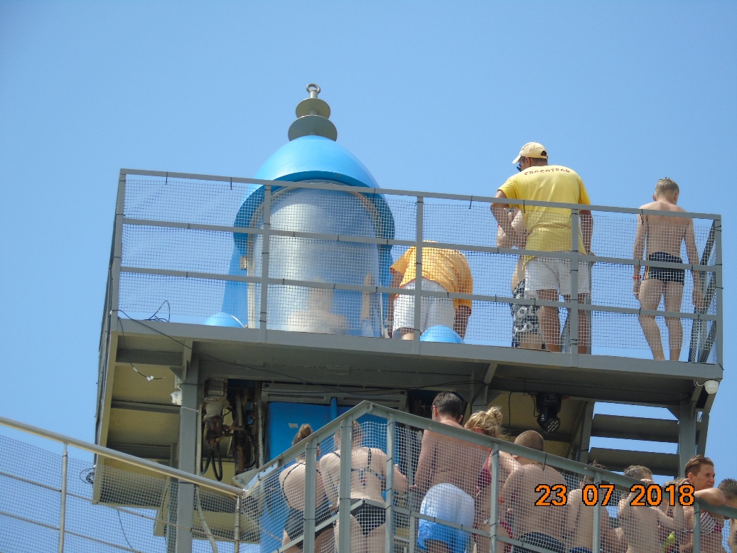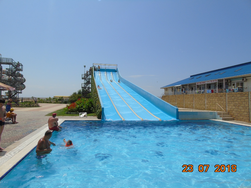 23.07 посетили крупнейший аквапарк Крыма «Банановая Республика». Цена билета на весь день взр. 1800, дет. 1200. Территория достаточно большая и зелёная. В сравнении с Золотой бухтой в Геленджике, здесь больше горок для детей, но очень неудобные раздевалки. Ячейки в камере хранения в одном месте, раздевалка и душевые в другом. Кстати, автостоянка оплачивается отдельно (200 руб), так же как и ячейка в камере хранения (200 руб.) Территория горок условно разделена на 2 части – старые горки и новые. Очереди большие.