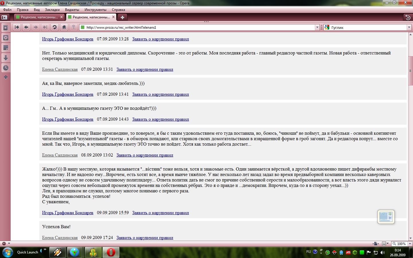 Орфография и пунктуация сохранены? Если так, то автора надо гнать, русским языку она плохо разговаривать уметь. А так - плоский юмор, как бывает всегда в наших газетах, когда пытаются изобразить что-то смешное. Этому автору - меньше смотреть Петросяна, тем кто пишет более "молодежно" - меньше читать башорг, вот и все дела. :) Не, орфография не сохранена. Лень было править опечатки после распознания текста со скриншота файнридером. Но тут наткнулся на занимательную весчь: http://www.proza.ru/2009/07/03/620, здесь без ошибок. И еще: данное высказывание улыбнуло с той же прозы.ру: поверьте, я бы с таким удовольствием его туда поставила, но, боюсь, "чиноши" не поймут, да и бабульки - основной контингент читателей нашей "изумительной" газеты - в обморок попадают, или стариков своих домогательствами в извращенной форме в гроб загонят. Да и редактора попрут... вместе со мной. Так что, Игорь, в муниципальную газету ЭТО точно не пойдет. Хотя как только работа достает... Елена Салдинская 08.09.2009 13:02 Заявить о нарушении правил (адрес странички: http://www.proza.ru/rec_writer.html?elenans1) Ниже - скриншот интернет-странички автора с этим высказыванием об ее "изумительном" издании. Сообщение отредактировал paralon - 25.9.2009, 23:16 -------------------- |