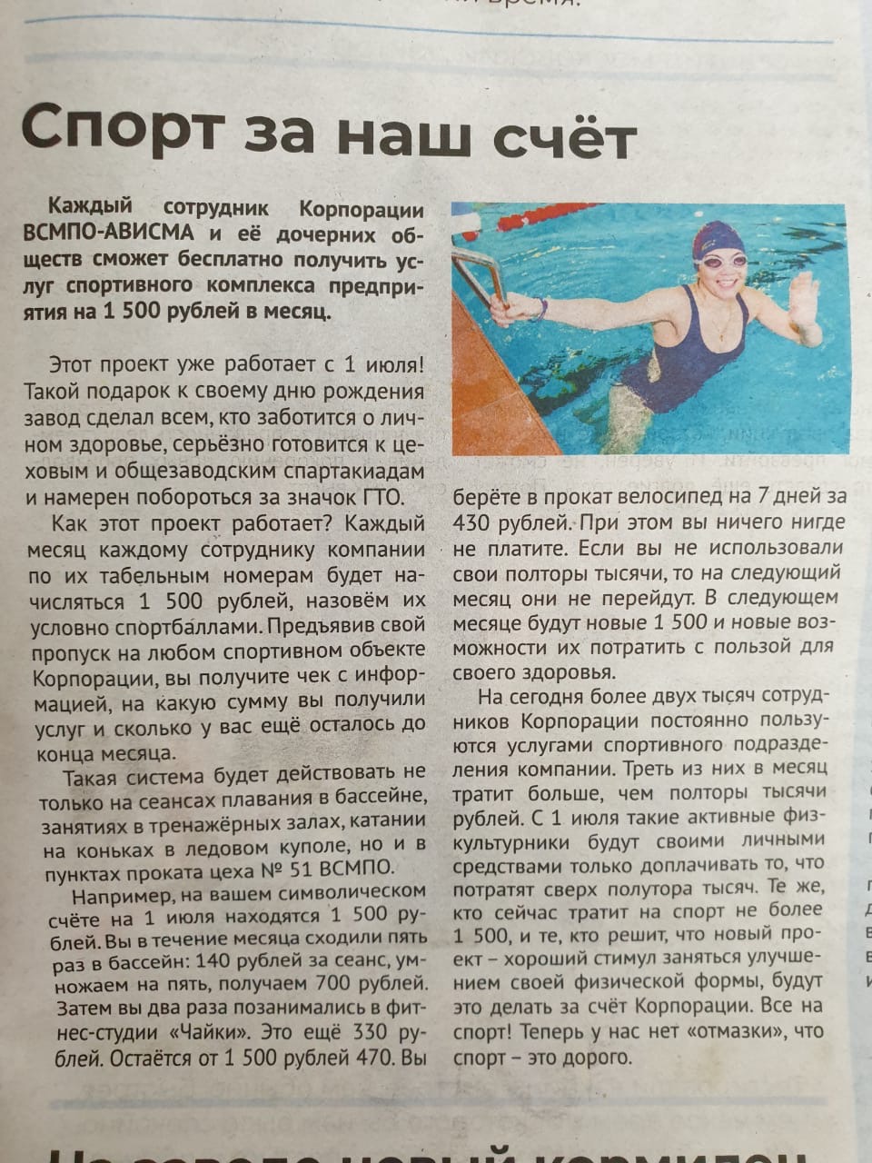 Сегодня слышал, что ВСМПО-АВИСМА будут выделять работникам дотацию на занятия спортом с 01.07.21. Может кто то знает подробнее…