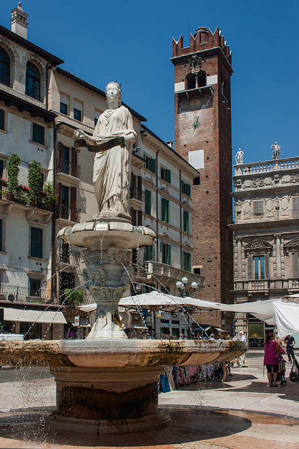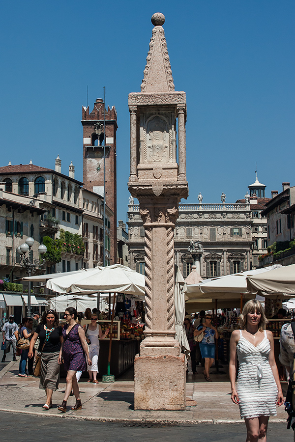 ...просто красивые виды практически невозможно выбрать момент, чтб никто не фотографировался :) Площадь Эрбе (Piazza Erbe)[attachment=80075:2012_06_...600_400_.jpg] Рыночная площадь Вероны, где торгуют сезонными продуктами и товарами. Люди любили собираться здесь ещё во времена Римской Империи, используя зелёную площадку в качестве форума. Уже 500 лет над торговыми палатками висит китовое ребро, привезённое в качестве сувенира с Востока одним из торговцев пряностями. Площадь Эрбе и сейчас занимает не последнее место в общественной жизни: рядом с ней расположились многочисленные уютные бары, а горожане именно отсюда начинают свои традиционные вечерние прогулки. На площади находится старинный монумент – Веронская мадонна. Это римская статуя 380 года. Над площадью возвышается башня Ламберти высотой 84 метра была возведена в 1172 году и является частью дворца Раджоне, в котором на протяжении нескольких веков заседал суд Вероны. Можно подняться на башню на лифте или пешком (интересно, что цена билета одинаковая на лифт и пешком) и полюбоваться прекрасной панорамой. Вокруг площади Эрбе расположены несколько самых роскошных дворцов Вероны: Палаццо Маффеи в стиле барокко, Торре-дель-Гарделло постройки XIV века и дом Мадзанти, служивший резиденцией семьи Делла-Скала. Напротив палаццо Маффеи, украшенного статуями Юпитера, Геркулеса, Минервы, Венеры, Меркурия и Аполлона – колона из белого мрамора с венецианским львом – символом Венецианской Республики. Вообще, в городах, которые входили в состав Венецианской Республики интересно играть в игру «найди льва с книгой». Как известно, открытая книга символизирует, что строительство велось в мирное время, в то время, как закрытая указывает на военное время. Сообщение отредактировал MaxM1970 - 7.1.2013, 16:09 -------------------- Улыбайся сегодня, завтра будет хуже.
