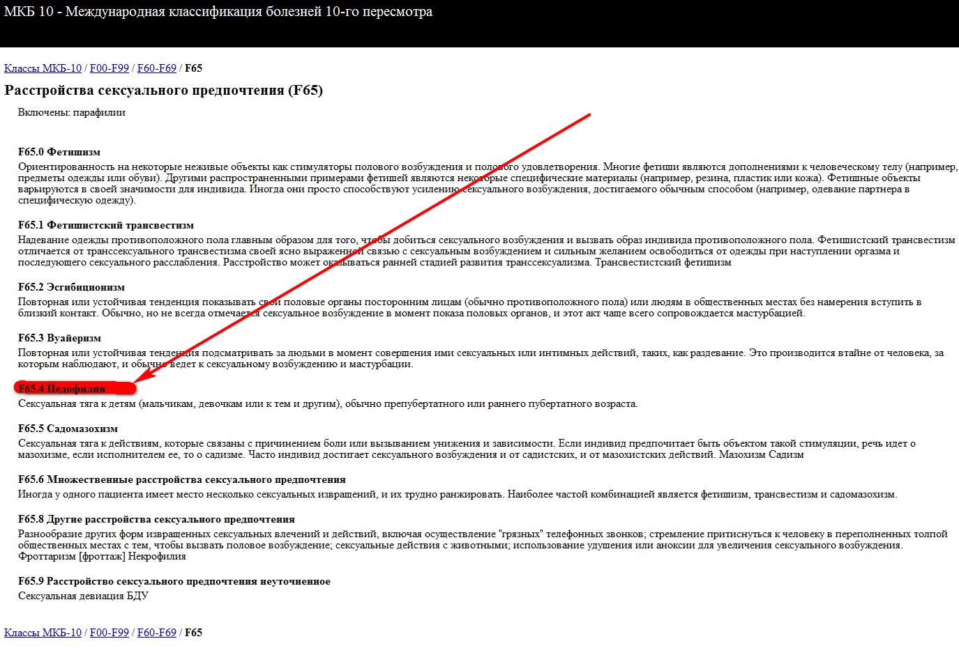 А теперь рассмотрим , что означает слово "педофил" . В общечеловеческом смысле все понимают , что это значит , но нас интересуют точные (юридически значимые) формулировки , а не размытое понимание в умах народа. Итак есть определение этого понятия в международной классификации болезней Цитата Расстройства сексуального предпочтения (F65) Включены: парафилии F65.0 Фетишизм Ориентированность на некоторые неживые объекты как стимуляторы полового возбуждения и полового удовлетворения. Многие фетиши являются дополнениями к человеческому телу (например, предметы одежды или обуви). Другими распространенными примерами фетишей являются некоторые специфические материалы (например, резина, пластик или кожа). Фетишные объекты варьируются в своей значимости для индивида. Иногда они просто способствуют усилению сексуального возбуждения, достигаемого обычным способом (например, одевание партнера в специфическую одежду). F65.1 Фетишистский трансвестизм Надевание одежды противоположного пола главным образом для того, чтобы добиться сексуального возбуждения и вызвать образ индивида противоположного пола. Фетишистский трансвестизм отличается от транссексуального трансвестизма своей ясно выраженной связью с сексуальным возбуждением и сильным желанием освободиться от одежды при наступлении оргазма и последующего сексуального расслабления. Расстройство может оказываться ранней стадией развития транссексуализма. Трансвестистский фетишизм F65.2 Эсгибиционизм Повторная или устойчивая тенденция показывать свои половые органы посторонним лицам (обычно противоположного пола) или людям в общественных местах без намерения вступить в близкий контакт. Обычно, но не всегда отмечается сексуальное возбуждение в момент показа половых органов, и этот акт чаще всего сопровождается мастурбацией. F65.3 Вуайеризм Повторная или устойчивая тенденция подсматривать за людьми в момент совершения ими сексуальных или интимных действий, таких, как раздевание. Это производится втайне от человека, за которым наблюдают, и обычно ведет к сексуальному возбуждению и мастурбации. F65.4 Педофилия Сексуальная тяга к детям (мальчикам, девочкам или к тем и другим), обычно препубертатного или раннего пубертатного возраста. F65.5 Садомазохизм Сексуальная тяга к действиям, которые связаны с причинением боли или вызыванием унижения и зависимости. Если индивид предпочитает быть объектом такой стимуляции, речь идет о мазохизме, если исполнителем ее, то о садизме. Часто индивид достигает сексуального возбуждения и от садистских, и от мазохистских действий. Мазохизм Садизм F65.6 Множественные расстройства сексуального предпочтения Иногда у одного пациента имеет место несколько сексуальных извращений, и их трудно ранжировать. Наиболее частой комбинацией является фетишизм, трансвестизм и садомазохизм. F65.8 Другие расстройства сексуального предпочтения Разнообразие других форм извращенных сексуальных влечений и действий, включая осуществление "грязных" телефонных звонков; стремление притиснуться к человеку в переполненных толпой общественных местах с тем, чтобы вызвать половое возбуждение; сексуальные действия с животными; использование удушения или аноксии для увеличения сексуального возбуждения. Фроттаризм [фроттаж] Некрофилия F65.9 Расстройство сексуального предпо