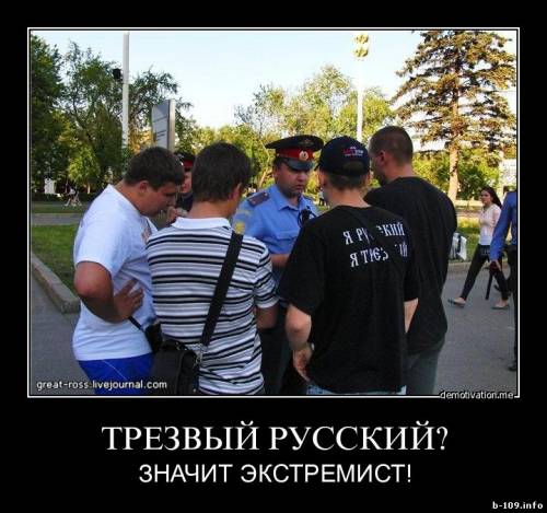 Национализм - это хорошо, но в условиях России нужно шире смотреть на это понятие, т.е. русские, башкиры, татары и даже кавказцы - все Россияне или как принято говорить - русские. На "Русской пробежке" в одном из городов правоохранительные органы попросили участников снять футболки вот с такой картинкой. Это реальный случай, когда русские милиционеры считают экстремизмом, когда человек указывает на то, что он хочет быть трезвым и что он русский. В полиции рабоиают люди, которые живут рядом с нами и только начав с себя и своего окружения мы сможем что-то изменить, а пока в головах жижа из ТНТ и Новостей - все будет только усугубляться. Сообщение отредактировал ZloVredina - 17.10.2013, 12:12 |