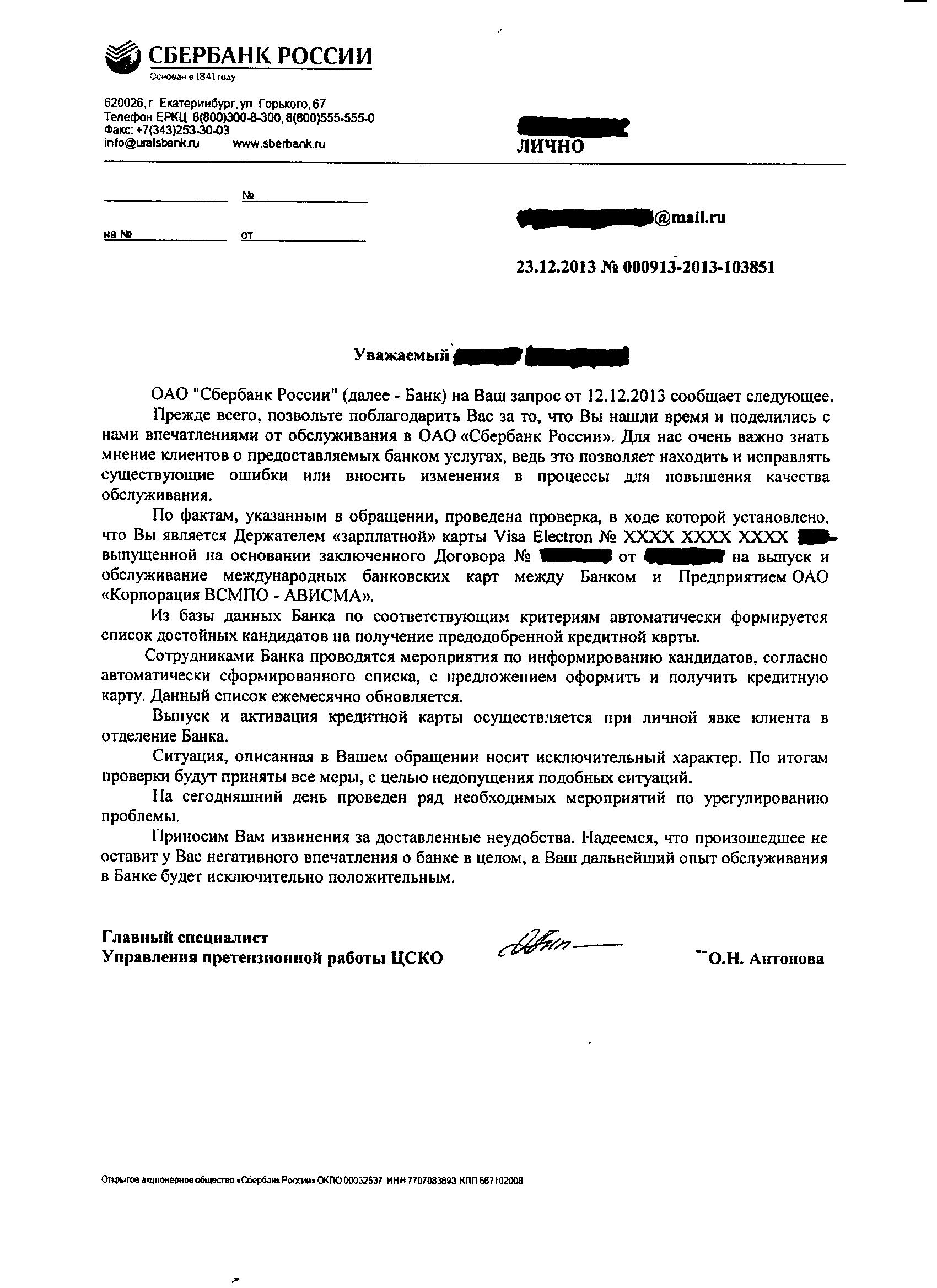 Ну вот и официальный ответ от Сбербанка на первое обращение: вину признали, счет закрыли, рассылку СМС-рекламмы и звонки отменили! Что и хотелось! А вот про раскрытие личных данных еще жду ответа! Админам за чистку темы отдельное спасибо!