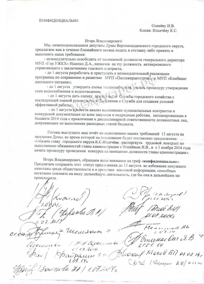 Прочитала тут http://mstrok.ru/?id=5078 часть копирую Закончилось это заседание для Игоря Оленёва письмом под грифом «Конфиденциально», подписанное двенадцатью «заводскими» депутатами. «Мы, нижеподписавшиеся депутаты Думы Верхнесалдинского городского округа, предлагаем вам в течение ближайшего месяца подать в отставку либо принять и выполнить наши требования», - сказано в письме депутатов. Среди требований депутатов: освобождение от должности гендиректора МУП «Гор. УЖКХ» Демида Ищенко, разработка программы по сохранению и развитию МУП «Пассажиравтотранс» и МУП «Комбинат школьного питания», утверждение схемы тепло- и водоснабжения, анализ муниципальных контрактов по всем закупкам и подрядным работам. «Отчёт по выполнению требований» депутаты готовы выслушать на заседании Думы 13 августа, во время которого обещают поставить вопрос о расторжении трудового контракта с Оленёвым. «Игорь Владимирович, обращаем ваше внимание на гриф ”конфиденциально”. Предлагаем сохранить этот статус предложения до 13 августа во избежание ненужного ажиотажа среди общественности и в средствах массовой информации, способных негативно повлиять на вашу дальнейшую деятельность, где бы она в дальнейшем ни проходила», - завершает своё письмо группа депутатов. Игорь Оленёв считает требования Верхнесалдинской думы незаконными и называет их шантажом. «Требования кого-то уволить или назначить это нарушение 131 закона – вмешательство в оперативно-распорядительную функцию. Что касается конфиденциальности, о которой просят депутаты, то я никаких обещаний по этому поводу не давал. Мне письмо это передал лично Ильичёв, сказав, что сам не знает о чём оно. При этом я уверен, что спикер, конечно же, был в курсе. Я не понимаю этой формулировки, что общество и пресса могут негативно влиять на мою работу. Это же как надо не любить свой народ!» - рассказывает Игорь Оленёв. Как заявляет сити-менеджер, он готов ответить перед Думой и народом за каждое своё решение, при этом отмечает, что образовавшаяся против него коалиция не предлагает ничего взамен, а просто формирует в обществе негативную оценку его деятельности. «На сегодняшний день двуглавая система в Верхней Салде себя явно не оправдывает. Ильичёв и Карасёва постоянно пытаются вмешиваться в принятия решений, создавая, тем самым, нестабильность. При этом они уже планируют рассмотреть вопрос о возврате к одноглавой структуре администрации. Но подождите! Вы же сами эту систему ввели, когда на общественных слушаниях большинство населения высказывались против. Я считаю, что жители Верхней Салды должны уже посмотреть на ситуацию с альтернативной точки зрения, а не через призму ТВ-ВСМПО или ”Новатора”, где мои слова регулярно перевираются», - заявил нашему агентству Игорь Оленёв. Отметим, что, помимо мэра Ильичёва, под письмом не подписались ещё шесть депутатов Верхнесалдинской думы – два представителя КПРФ, либерал-демократ, «справедливоросс», одномандатник и сотрудник «ВСМПО-АВИСМА», «единоросс» Алексей Нестеров. При этом, для того, чтобы решения Думы были легитимными, необходимо набрать две трети голосов депутатов, поэтому в случае, если хотя бы один из подписантов не поддержит борьбу с Оленёвым, думская коалиция развалится. На диалог с депутатами сити-менеджер уже не надеется. Игорь Оленёв заявил нашему агентств