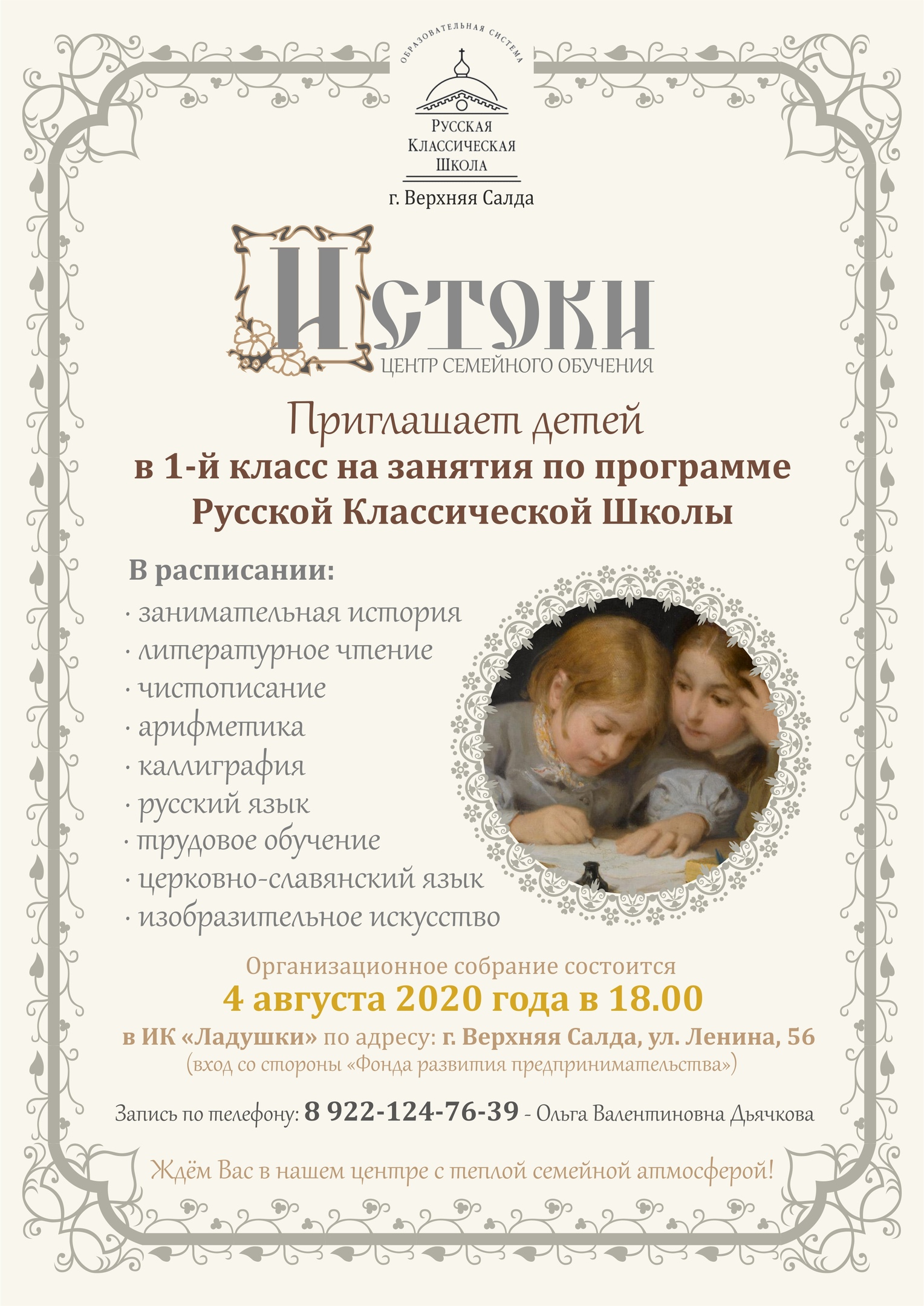 Уважаемые родители, приглашаем Ваших детей - первоклассников и дошколят на обучение по программе РКШ, которая вобрала в себя всё самое лучшее из дореволюционной и советской образовательных систем! Одно из главных преимуществ данной программы - это исключительно очное обучение, а также малочисленные группы (классы), что обеспечивает индивидуальный подход к ребенку! Рекомендуем всем, кому не безразлично образование своих детей! И ждём на орг.собрание 4 августа в 18.00! Запись по телефону: 8 922-124-76-39 - Ольга Валентиновна Дьячкова (руководитель ЦСО "Истоки") |