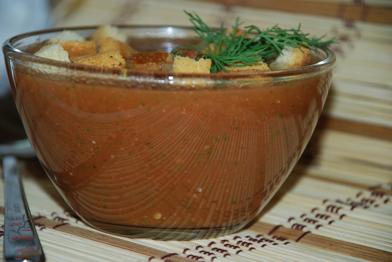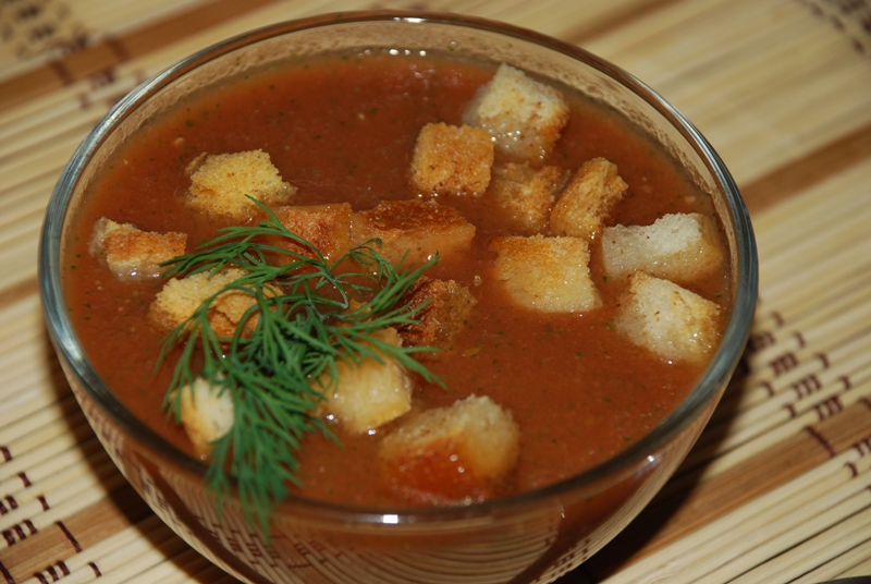 Ой, извините, что не выложила рецепт)) Сейчас уже не совсем актуален рецепт, но напишу - следующим летом может пригодиться кому. Томаты (3-4) очищаем от кожицы, режем на несколько частей, добавляем к помидорам огурец, очищенный болгарский перец, зелень, чеснока несколько зубчиков, соль,приправы по вкусу, немножко оливкового масла и все измельчаем блендером. Даем настояться в холодильнике, разливаем по тарелочкам и добавляем сухарики. На сайте выкладывали видеорецепт летом http://vsalde.ru/salda-news/other/4652-gas...nyj-recept.html |
