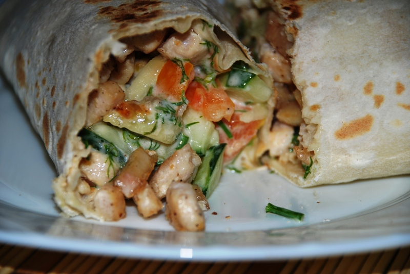 шаурма - быстро и вкусно) Надо: лаваш тонкий, мясо или куриное филе, или свинина, огурцы, помидоры, зелень, майонез. Мясо (у меня в этот раз филе было куриное) обжарить на масле подсолнечном (посолить, поперчить) до готовности. Огурцы, помидоры, зелень порезать не очень крупно, заправить майонезом. Лист лаваша (какие продаются у нас) разрезается пополам. На край выкладываем мясо и салат. Заворачиваем. Обжариваем со всех сторон на сухой разогретой сковороде. И сразу после этого съедаем - лаваш получается очень хрустящий.. |