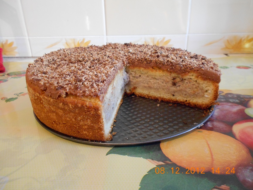Торт "Сундучок" Рецепт бисквита: 5 яиц 1,5 стакана сахара 1,5 стакана муки 1 чайная ложка разрыхлителя ванилин Взбить миксером 5 яиц, 2-3 минуты на самой большой скорости (можно добавить щепотку соли). Добавить сахар и ванилин, перемешать. Добавить муку и разрыхлитель, перемешать. Вылить тесто в форму (форму предварительно смазать маргарином и посыпать манкой, чтобы бисквит не прилип), оставить минут на 10-15 настояться. Поставить в разогретую до 200 градусов духовку, выпекать 40-45 минут. Начинка: 1 банан 50 гр. грецких орехов 500 гр. сметаны 8 столовых ложек сахара 3 столовых ложки горячего шоколада (сухого) (я брала "Аристократ", можно использовать Несквик) 2 шоколадных конфеты Крем №1 Банан размельчить в пюре блендером (можно растереть вилкой). Грецкие орехи размельчить. Перемешать 350 гр. сметаны, 5 столовых ложек сахара, банановое пюре, грецкие орехи. Это крем для внутренней начинки. Крем №2 Перемешать 150 гр. сметаны, 3 столовых ложки сахара и 3 столовые ложки горячего шоколада. Получится крем для верхней части торта. Остудить бисквит, срезать верх бисквита, получится "крышка для сундучка" толщиной 5-6 мм. Столовой ложкой достать середину (мякиш) и перемешать с кремом №1, сложить обратно в бисквит. Закрыть "крышкой" - срезанной частью бисквита. На торт выложить крем №2 и посыпать тёртым шоколадом или тёртыми шоколадными конфетами. Торт убрать в холодильник на 5-6 часов. Сообщение отредактировал ZloVredina - 8.12.2012, 21:47 |