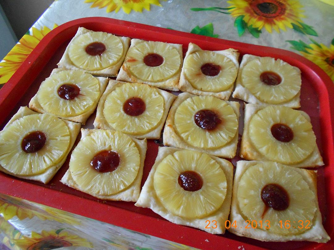 Печенье с Ананасами и клубникой Берется слоеное тесто (хоть дрожжевое, хоть бездрожжевое), пара банок консервированных ананасов кружочками и клубничное варенье. Тесто раскатать толщиной 3 мм, нарезать квадраты со стороной примерно 10 на 10 см. Выложить квадратики на противень, застеленный пергаментом, выложить кружки ананасов на тесто. Поставить в духовку на 20-30 минут. Когда печенье приготовится, снять его с пергамента и в серединки ананасов выложить клубнику из клубничного варенья. |