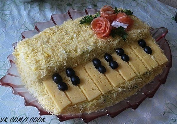 САЛАТ "БЕЛЫЙ РОЯЛЬ" Необходимые ингредиенты: -►500 г куриного мяса -►300 г грибы -►2 шт св. огурец -►3-4 шт. яйца -►100 г сыр Как приготовить: 1 слой - отварная курица 2 слой - майонез 3 слой - жареные грибы 4 слой - майонез 5 слой - свеж. огурец (натереть на терке) 6 слой - майонез 7 слой - вареные яйца (натереть на терке) 8 слой - майонез 9 слой - сыр (натереть на терке) Украсить по желанию. Приятного аппетита:) -------------------- *composer* Музыкант - это состояние, а не то, что ты о себе думаешь.