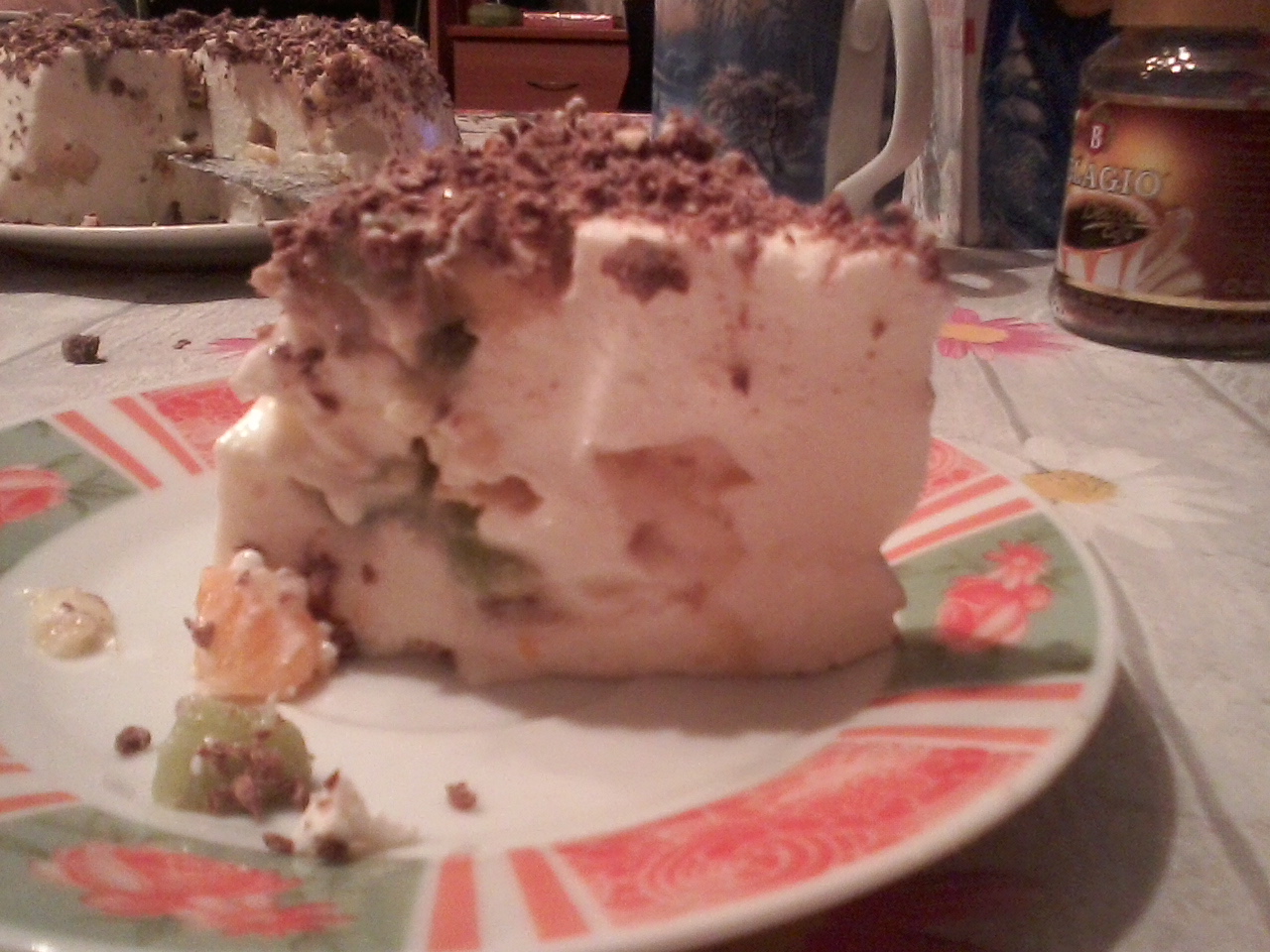 Творожный десерт: Ингредиенты: 400 гр обезжиренного творога 250 гр сметаны 1 стакан сахара 1 пакетик желатина (20 гр.) 200 мл холодной воды Начинка вариант 1 (размороженные ягоды) 100 гр. клубники 100 гр. малины 100 гр. черники Начинка вариант 2 2 мандарина (или 1 апельсин) 2 банана 2 киви Фрукты резать помельче, чтобы начинка не вываливалась, когда отрезаете кусочек. Начинка вариант 3 1 банка консервированных персиков (ананасов, вишни, черешни, клубники, груши, или фруктового ассорти) Рецепт приготовления: Желатин замочить в 200 мл холодной воды на 15-40 мин. Затем постоянно помешивая довести до кипения, но не кипятить. Смешать творог, сметану, сахар. Взбить массу блендером, чтобы она стала однородной. Добавить подготовленный желатин, хорошо перемешать ложкой. На дно глубокой миски выложить начинку, залить сверху творожной массой. Поставить в холодильник на 3-4 часа. Затем аккуратно выложить получившийся творожный десерт на плоскую тарелку. Сверху посыпать тертым шоколадом или какао. Хранить в холодильнике. Фоткала на телефон, поэтому качество уг Сообщение отредактировал Ящерица - 9.1.2015, 18:09 |
