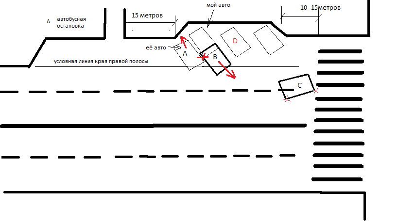 здравствуйте!!! хочу спросить вашего мнения как начальника экзаменационного отделения: Имеем 4 автомобиля(фактически только 2)- А В С D. А - авто девушки, который я поцарапал. В - мой авто. С- посторонний авто который к аварии никаого отношения не имеет. С чего началось: я начал сдавать задним ходом заметив авто С остановился уже фактически на проезжей части(более жирный).. Увидев что авто С перестраиваеться на другую полосу я продолжил движение вывернув руль, чтобы выехать ровно на правую полосу и не мешаяя левой куда повернул авто С. Во время выворачивания руля с левой стороны по прежнему было "чисто" и никого не было. Однако вывернув руль и по новой убедившись что никого нет начал сдавать медленно назад почувствовал что машина зацепилась за что то. И это был авто А с Вопрос : как по вашему кто прав а кто виноват? есть ли тут обоюдная вина??? есть ли тут вина только авто А???? Сообщение отредактировал ПВА - 1.9.2015, 17:51 |