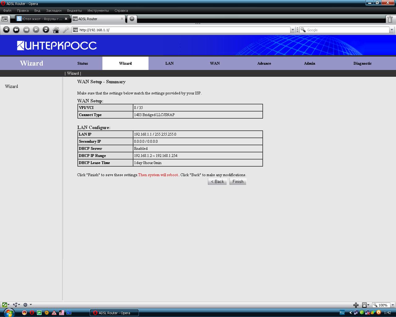 не знаю как он его убирает а после нажатия финеш пишет---The DSL Router has been configured and is rebooting. Close the DSL Router Configuration window and wait for 2 minutes before reopening your web browser. If necessary, reconfigure your PC's IP address to match your new configuration Маршрутизатор DSL был настроен и перезагрузки. Закрыть DSL маршрутизатор конфигурации окна и подождать 2 минуты до открытия веб-браузера. В случае необходимости перенастроить IP адрес компьютера в соответствии с учетом новой конфигурации |
