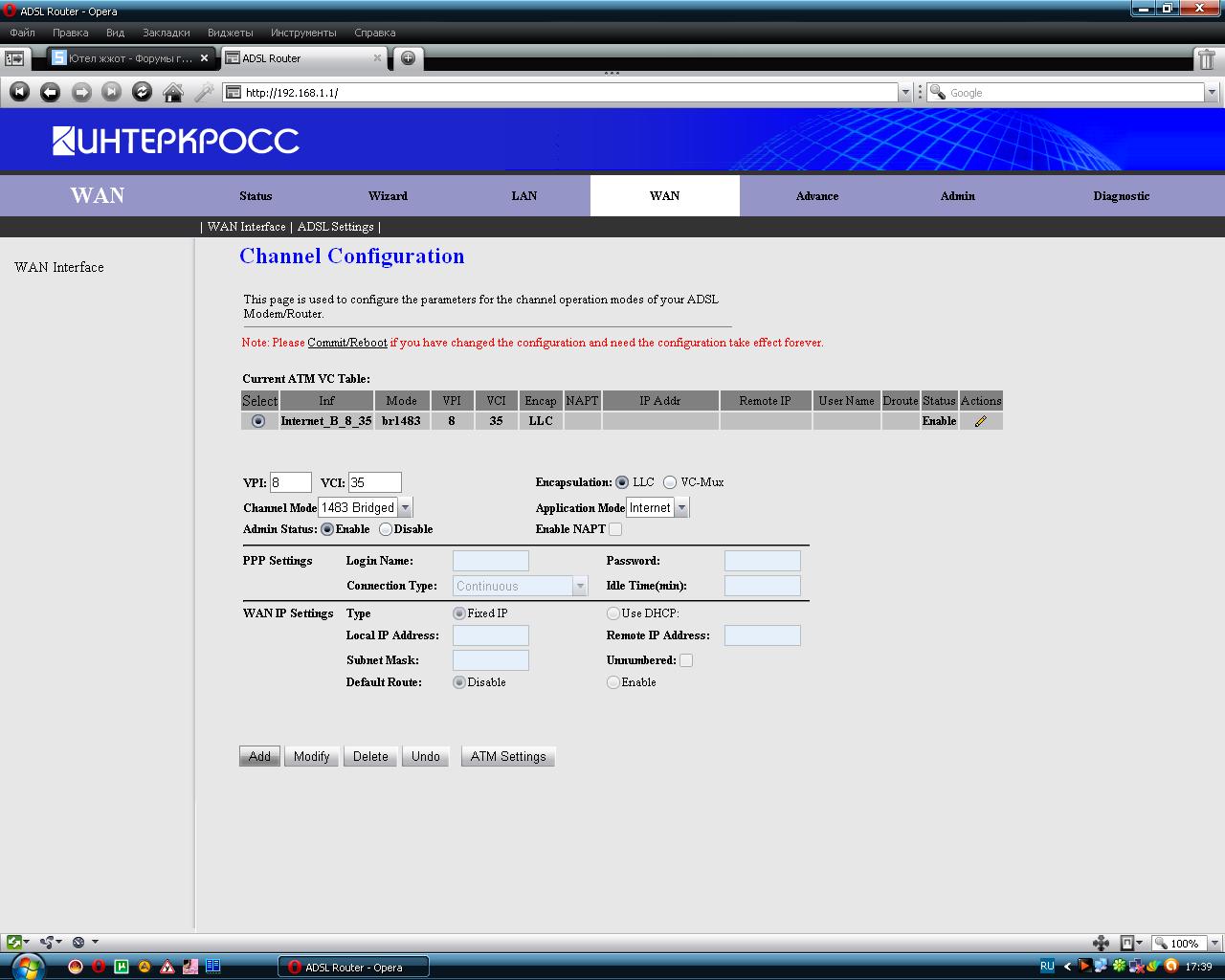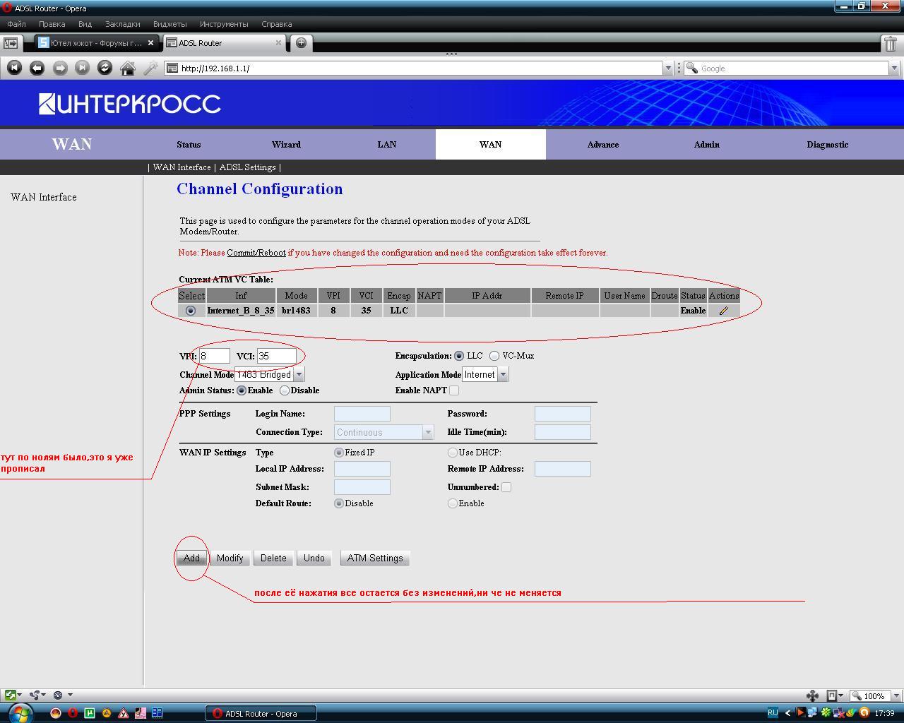 даже на этой странице прописываю,и все ровно не меняется вот ведь у тебя всё ставится и чётко написано.... [attachment=3497:вот.JPG] -------------------------------------- сбрось модем.... сзади есть маленькая дырочка и там кнопочка внутри ты туда засунь ручку например.... кнопочку нажми и подерхи нажатой секунд 10-15 и иодем сбросится потом заново выстави настройки vpi vci |
