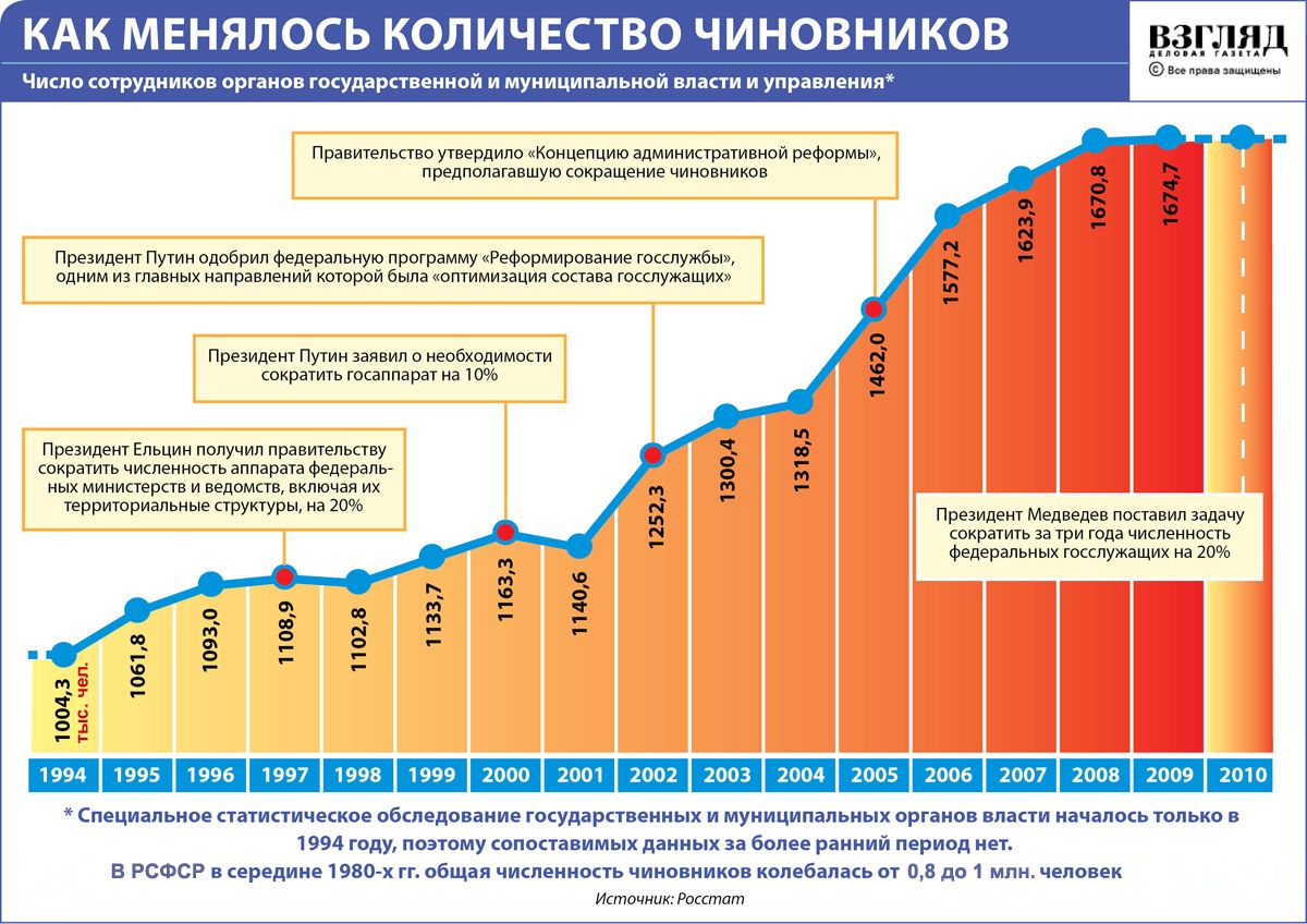 Все не так уж и плохо, в сравнении Количество госслужащих в некоторых странах (на 1000 человек) Во Франции - 71,7 В США - 70,4 В Японии - 33,4, В Норвегии - 24,7 В Южной Корее - 18,5 http://www.rg.ru/2006/04/13/chinovnika.html Кроме того число бюрократов во всех бывших соцстранах резко выросло потому, что госаппарату пришлось принимать на себя многочисленные функции, выполнявшиеся раньше правящими компартиями и их структурными подразделениями (тем же комсомолом). В той же РСФСР партийных и комсомольских деятелей «на окладе», принимавших участие в госуправлении, насчитывалось около 400 тысяч человек. Также следует учитывать, что не все из российских госслужащих непосредственно являются чиновниками. Сообщение отредактировал Стас - 31.5.2011, 20:13 -------------------- I'll Be Back! Hasta La Vista Baby!