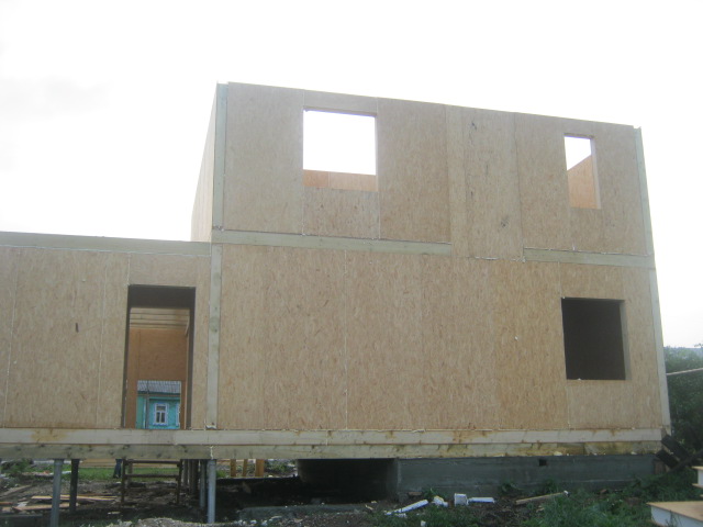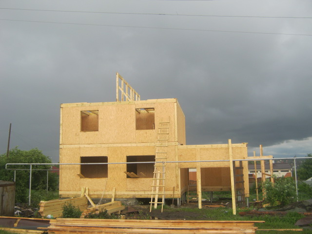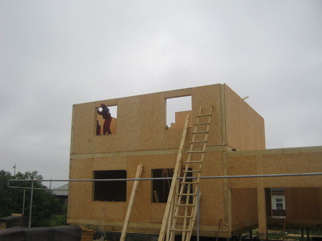 Несмотря на отвратительную погоду, бригада закончила сегодня монтаж межкомнатных перегородок, установила оконные и часть дверных перемычек и закончила монтаж заглушек сверху СИП панелей для дальнейшего монтажа чердачного перекрытия. Не боитесь, что панели сырые будут и дом начнет гнить и влажно в нём будет ? -------------------- |