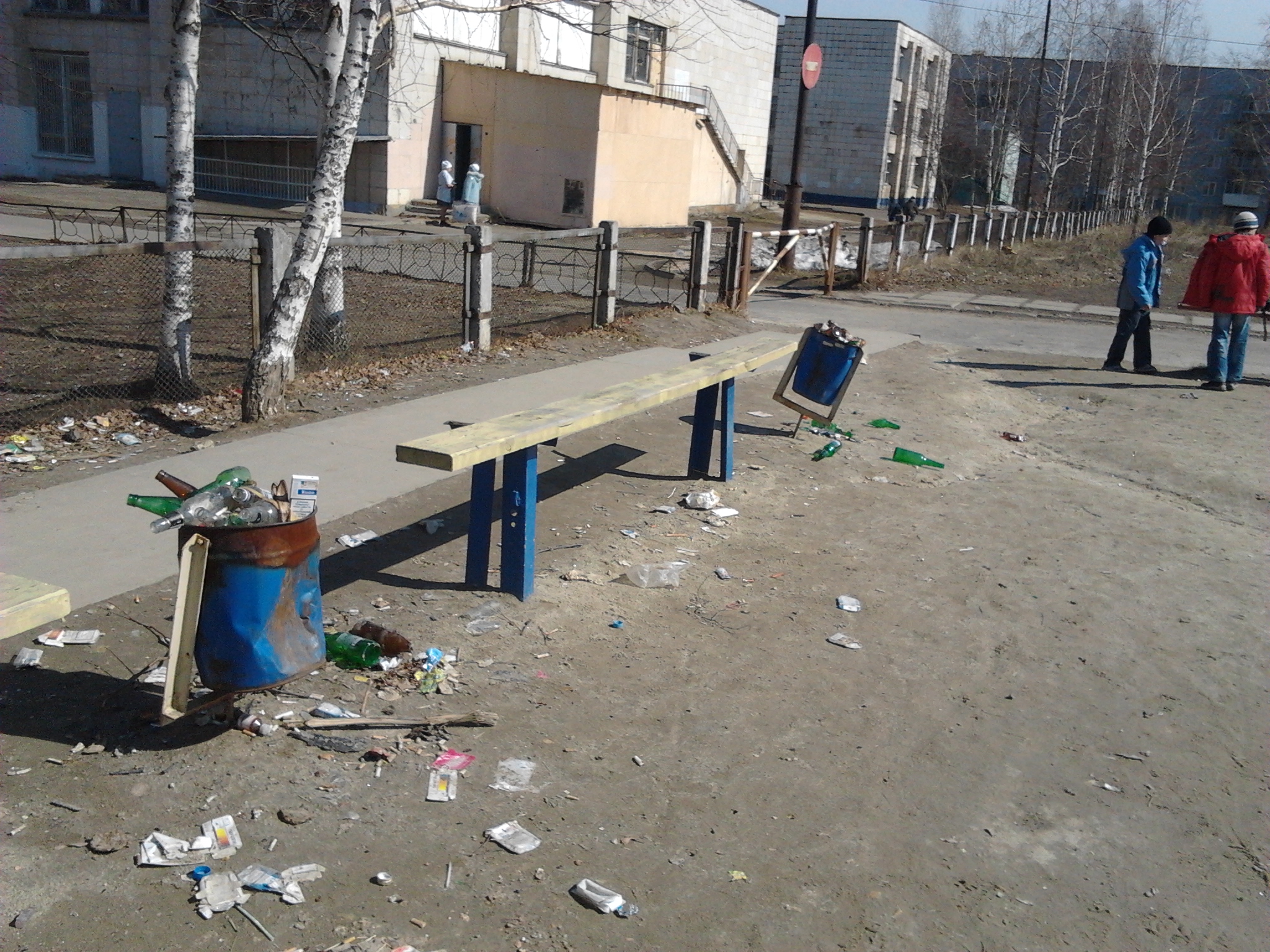 Вот площадка у торгового. Гуляем там ежедневно... Может тогда видели того Геракла, который так смог бросить что-то в урну (на третьем фото ближняя)... Нечеловеческая сила, блин... С кем боремся и как бороться? Если он(а) урну так, то что с ребрами будет сделай мы замечание? А если серьезно, то снова перечитывать "Собачье сердце". Там были ответы о разрухе и как с ней бороться. Ничего непоменялось. Сообщение отредактировал Новенький - 13.4.2011, 16:00 -------------------- мыши плакали, кололись, но продолжали жрать кактус