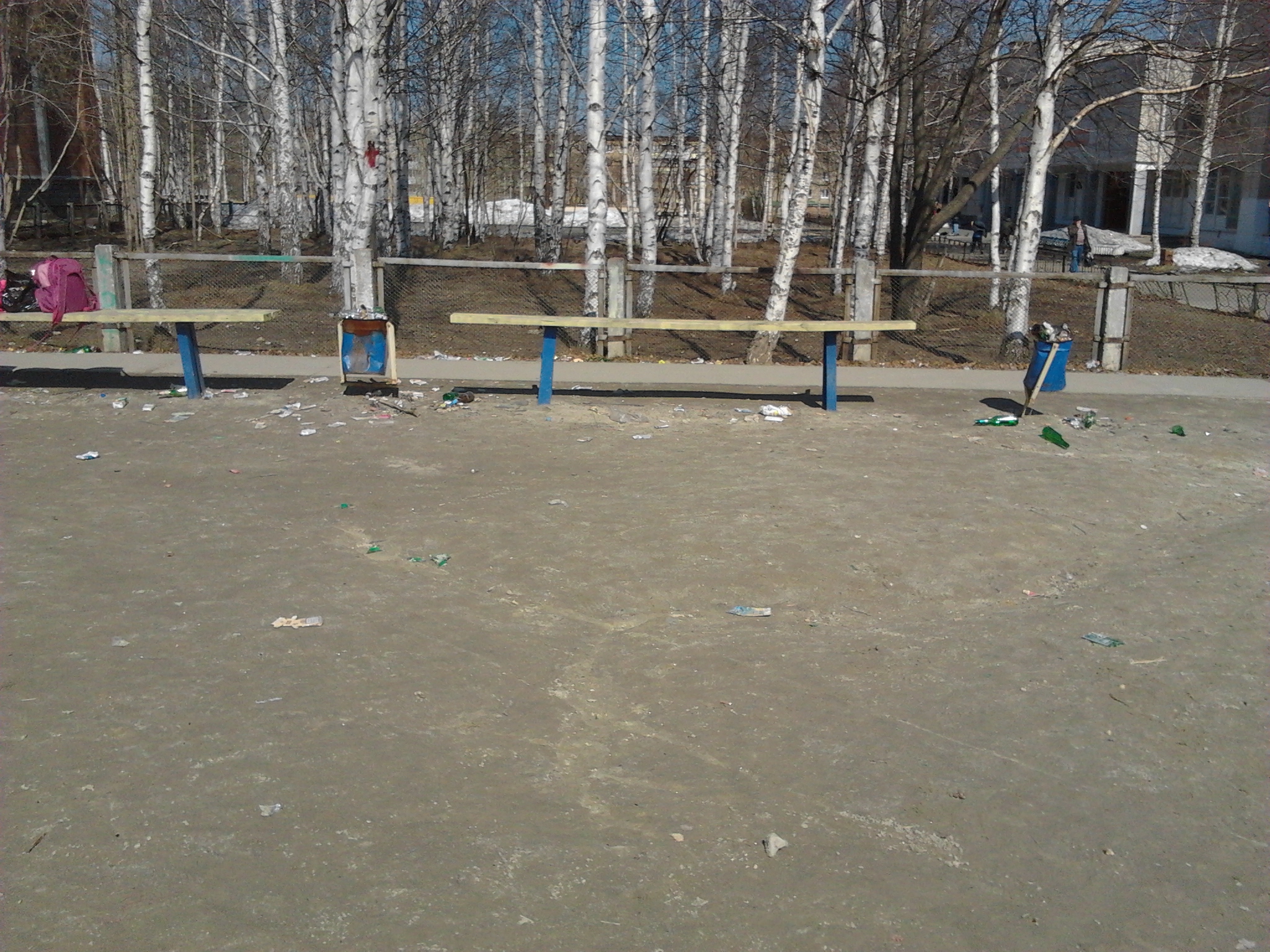Вот площадка у торгового. Гуляем там ежедневно. В городе во дворах уже как несколько дней все прибрали и нет мусора, а площадка интересно кому принадлежит? Толи хозяину импульса? Салтыкову или Семенцову???? Почему там не прибирают? Понятно, что часть мусора осталась после зимы. Зимой также в мусорках после пт сб дискотек в импусльсе мусорки были битком набиты бутылками.Может стоит обязать импульс по воскресеньям убирать бутылки? Есть и категория родителей которая там не прочь выпить, пока их чадо гуляет) Еще бы не помешало песка в песочницы насыпать, с прошлого года песочницы пустые.