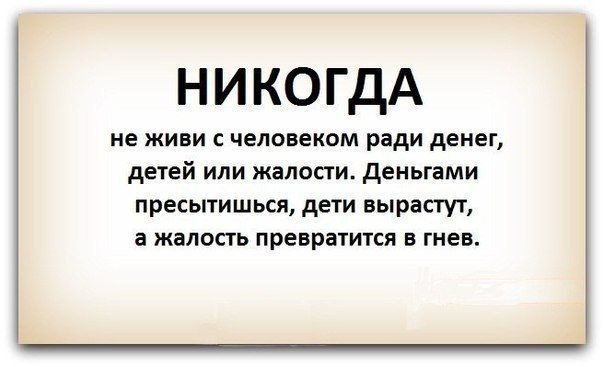 Твои рассуждения не в кассу ни разу )) Дочке своей искренне пожелаешь такого старшей? Живи доча с парнем, поыиг, что щамуж не зовёт, он ведь говорит, что любит... А я знаю как молодые парни между собой разговаривают про сожительниц Многие из парней сами хотят именно жениться, т.к. на данный момент думают, что всю жизнь проживут. И лучше пару раз честно жениться, чем так то с одной, то с другой жить. а ты действительно думаешь что у тебя ореол над головой из за того что тебя муж после печати распечатал появился ?? и ты стала по отношению к другим которые сначало начинают жить а потом расписываются святой ? если люди уже не просто встречаются а жить вместе начинают то уже исходя из побуждений а не для случки... ну а разойтись если что то не так пошло ни штамп ни брак ни теща на коленях не помешает... и я не вижу в этом ни чего страшного, по крайней мере люди пробуют и узнают друг друга и в быту и в постели, а не сталкиваются с этим же самым после свабди..., тут хоть до лишней траты денег не доводится ( ты жо у нас материалист,посчитай выгоду ))) в чем разница два три оф. пробных брака или без официоза ))) не зря же ты так усердно за другими подсматриваешь, а как там у них, как так они и счастливы ...была бы своя жизнь то в чужую не лезла -------------------- УСТУПАЙ ДОРОГУ ДУРАКАМ ...