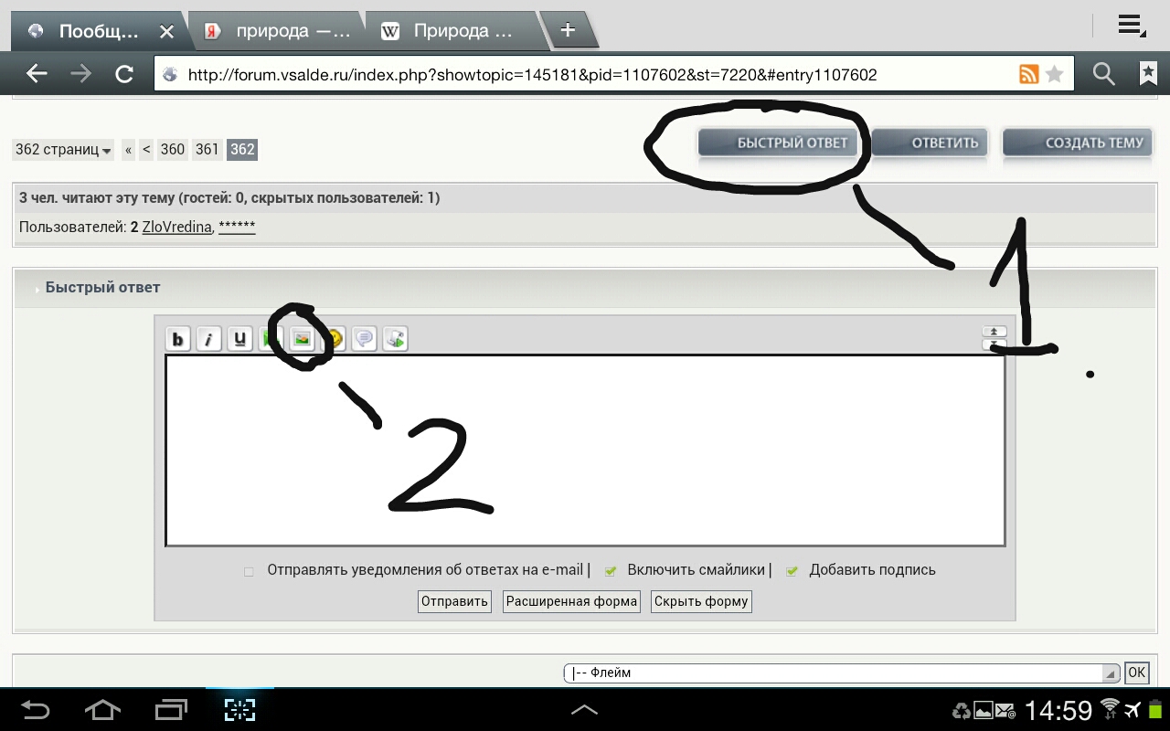 Еще один вариант того же действия. 1. Скопировать ссылку на изображение. 2. Вставить в то же окно где печатают текст сообщения. 3. Перед началом текста ссылки написать (без пробела) [img] 4. В самом конце ссылки написать [/img] 5. Отправить. Сообщение отредактировал ZloVredina - 8.8.2014, 14:04 |