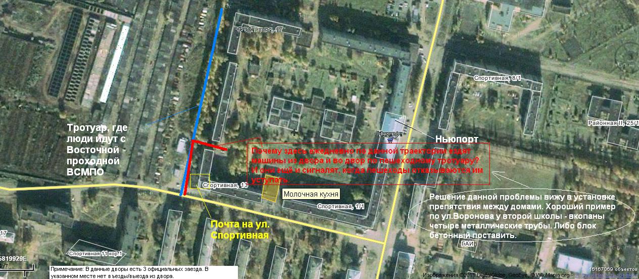 Площадки для выгула собак действительно не очень-то и нужны, в какой район не глянь где-нибудь да есть полянка, по которой кроме собаководов никто не ходит почти. Я собаковод из района "живые и мёртвые", ежедневно вижу как собаководы выгуливают питомцев за жилыми домами вдоль автомобильной дороги К.Маркса, мы там никому не мешаем. Есть более наболевший вопрос для многих пешеходов, кто ходит на работу к Восточной проходной мимо почты на ул.Спортивная. Ежедневно на тротуар, особенно в вечернее время, по траектории, указанной красным цветом, выезжают из двора и заезжают во двор автомобили, которым видимо лень объехать по внутриквартальной автомобильной дороге и выехать/заехать возле "Молочной кухни". Сообщение отредактировал ZloVredina - 29.8.2011, 20:29 |
