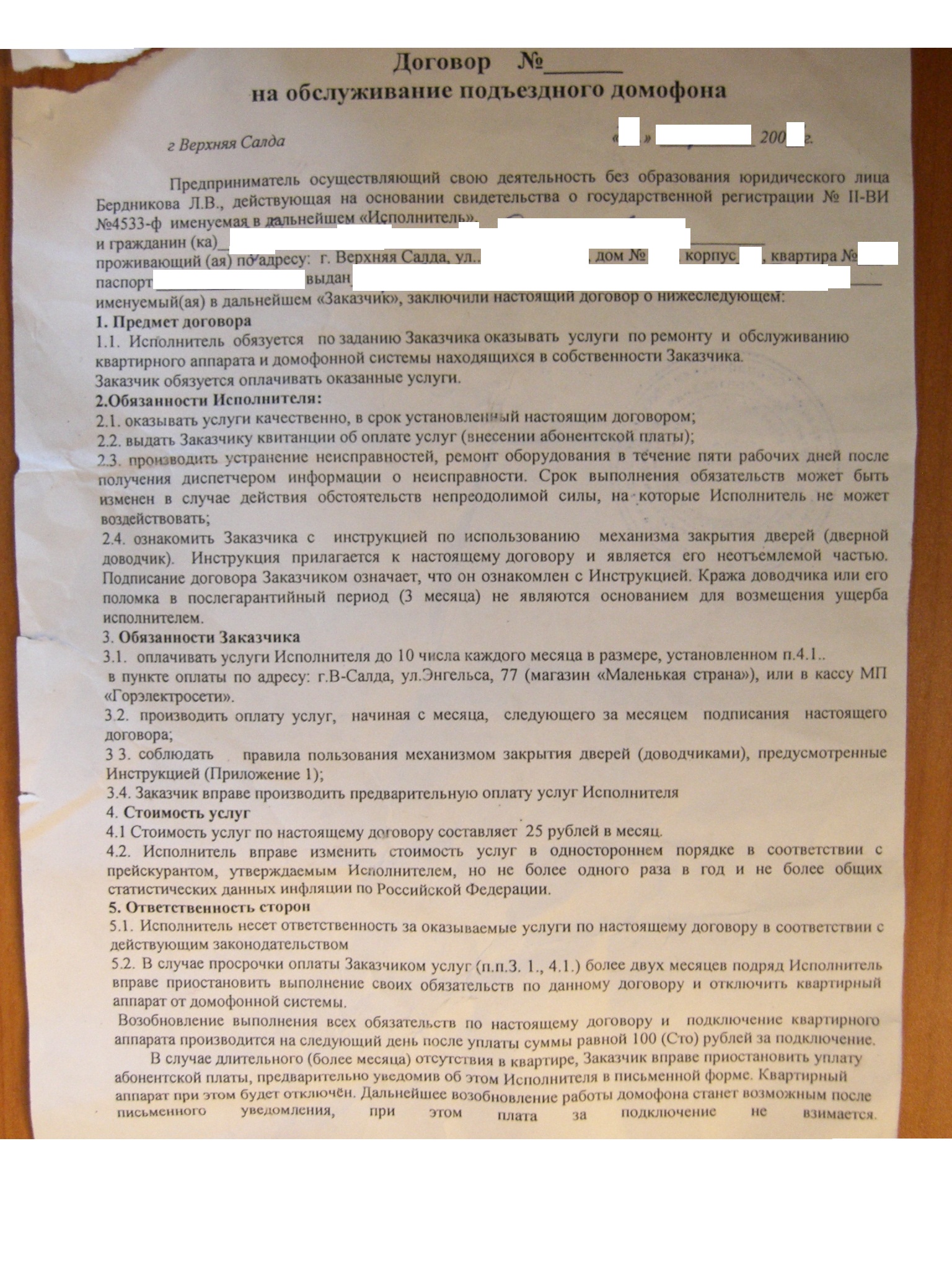 Вот договор, который подписали жильцы одного из подъездов в доме в городе Верхняя Салда. Правомерно ли отключение трубки в квартире у одного из жильцов за невнесение абонентской платы, если по факту никаких услуг (документально подтверждённых) Исполнитель не оказывал? Заказчик к Исполнителю за услугами не обращался. |