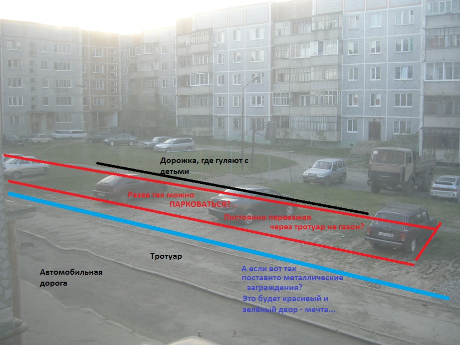Газоны обрезать надо. Против автомобилизации не попрёшь Заграждения логичнее, проще и дешевле сделать. В других дворах ведь так безобразно не ставят на газоны машины, тем более переезжая через тротуар. Утром по тротуару ведут детей в детский сад, школьники идут, на работу люди. А тат на тебе, обязательно кто-нить да пятится прямо в тебя на своей железной каракатице. |