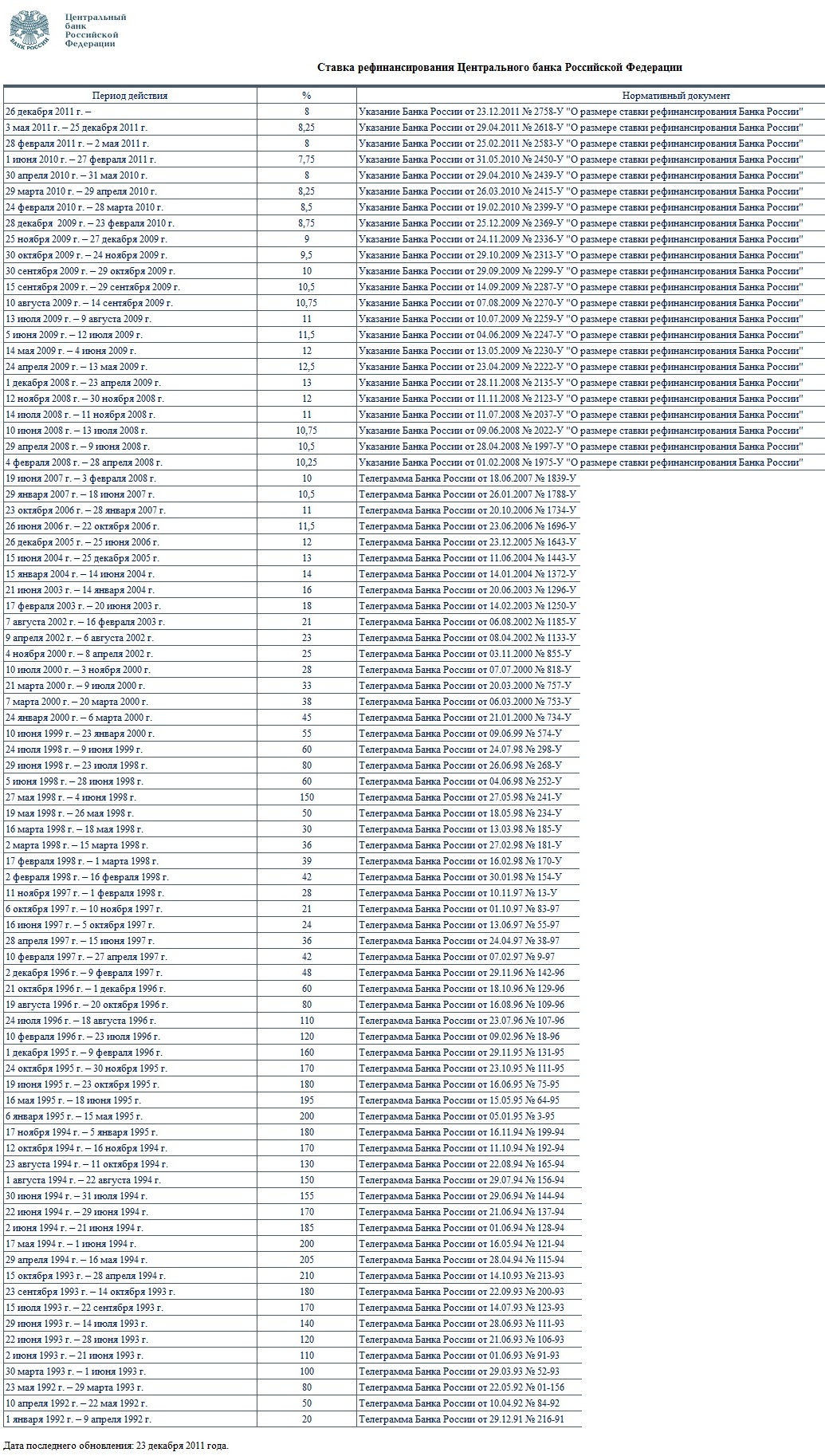 Немного добрых слов о "путинском режиме". Откроем сайт Центрального банка Российской Федерации и найдем на главной странице небольшую надпись "Ставка рефинансирования - 8%". Что такое ставка рефинансирования? Ста́вка рефинанси́рования — размер процентов в годовом исчислении, подлежащий уплате центральному банку страны за кредиты, предоставленные кредитным организациям. Деньги - кровь экономики. Хочешь честно развивать бизнес, возьми у ЦБ РФ кредит, под процент определяемый ставкой рефинансирования. Восемь процентов годовых это много или мало? Откроем историческую справку и посмотрим ставку рефинансирования в 93х-96х годах. Стали бы вы под такой процент брать кредит? Оценим изменение ставки рефинансирования в годы правления ВВП и задумаемся... Сообщение отредактировал bige® - 14.1.2012, 17:05 -------------------- This is my manifest - I'm number one, I am the best (с) Л.Трубецкой