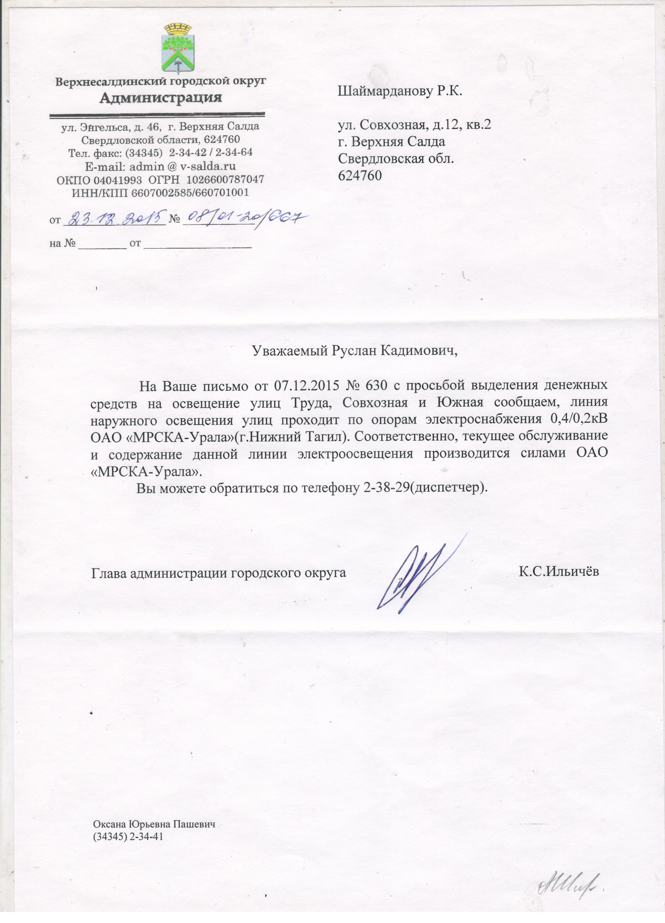 Жалуйтесь в Правительство Свердловской области http://www.midural.ru/100036/ и http://letters.midural.ru/webrec/ Видите ли, бюджет они заложили на 2016 год и у них нет средств на площадки, а на повышение своей з/п в разы в кризисный период страны, когда Правительство РФ ищет пути оптимизации экономики и расходов, городские салдинские шырли-мырли чиновники в думе повышают себе з/п (кстати, губернатор должен обязательно об этом узнать). Более того, какой бюджет города на площадки??? Площадки финансируются из регионального правительство по программе развития районов городов. П*zдят гор. думцы, деньги себе в карман и + повышение себе з/п, вот и вся арифметика. Пишите жалобу губернатору. [/quote] Я жду ответа от Забродина ,если такой же ответ будет как и у Ильичева К.С. ( что не сомневаюсь) , то вынужден обращаться к вышестоящему руководству. У нас немало проблем накопилось -например отсутствия уличного освещения-на весь микрорайон 6-7 светильников и те на одной улице.По поводу освещения -Ильичев К.С. написал, что мол обязанность по уличному освещению в Вашем микрорайоне лежит ( вдумайтесь!) на юр. лице (ОАО МРСКА-Урал), то есть город обязал юр лицо выполнять обязанности города, хотя данное юр. лицо всего лишь поставляет энергию владельцем домов. Дебилизм. Вот жду ответа по этому поводу ,а потом со всеми ответами полученными от местных властей - либо на прием к главе региона , либо письменно обращусь. |