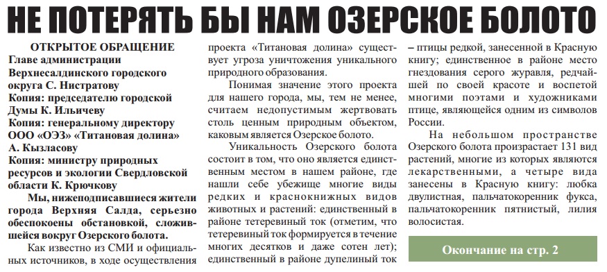 Уважаемые салдинцы! На территории Верхнесалдинского городского округа на протяжении многих лет существует Озерское болото. Его уникальность заключается в том, что оно является местом обитания редчайших и исчезающих видов животных и растений, занесенных в Красную книгу Свердловской области. ![]() С началом строительства "Титановой долины" перед болотом возникла угроза быть стертым с лица Земли, так как по проекту данный производственный объект частично располагается на территории Озерского болота. Без сомнений, "Титановая долина" имеет немаловажную экономическую значимость для нашей страны, области и города в частности, но стоит задуматься и о проблемах, вызываемых ею. Ознакомившись с подробностями данной ситуации, мы нашли решение. Если Озерскому болоту будет придан статус охраняемой территории, "Титановая долина" изменит проект и сместит свои границы. В Верхней Салде была создана инициативная группа "Право на жизнь", выступающая в защиту уникального болота. Если вы неравнодушны к данной проблеме, которая касается не только нас, но и наших будущих детей, ведь при подобных бездействиях экологическая проблема станет неминуема, поддержите своим голосом защитников Озерского болота. Какую природу вы хотите оставить нам - детям? А потому, охраняйте то, что берегли до вас! P.S. Фото Сергея Иванова |