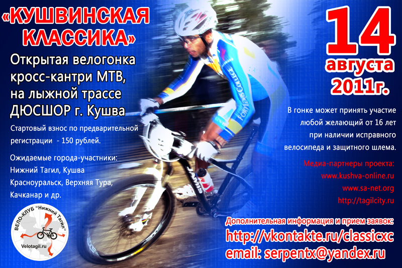 14 августа 2011 года на лыжной трассе ДЮСШОР города Кушва, состоится велогонка в дисциплине кросс-кантри МТВ - "Кушвинская классика". Принять участие в гонке может любой желающий в возрасте от 16 лет, при наличии исправного велосипеда и жесткой каски или велошлема. Что такое "Кушвинская классика"?: "Кушвинская классика" это возможность на один день забыть обо всем на свете и почувствовать себя гонщиком. "Кушвинская классика" это динамичная и скоростная трасса, со спусками под 60 км/ч. "Кушвинская классика" это испытание для сильных духом и телом! "Кушвинская классика" это сорвенование, которое доступно всем! "Кушвинская классика" это море положительных эмоций и адреналина! Регистрируйтесь, приезжайте и побеждайте! Любители велосипеда и маунтинбайка в частности, если вы не уверены в своих силах, не стоит просиживать выходной дома - приезжайте, участвуйте или просто смотрите, как гоняются ваши друзья по увлечению! Подробную информацию о гонке узнавайте здесь: http://vkontakte.ru/classicxc положение соревнований: http://vkontakte.ru/topic-29060156_24928194 Адрес электронной почты: serpentx@yandex.ru. Пишите, звоните, участвуйте - ждем вас на старте! |