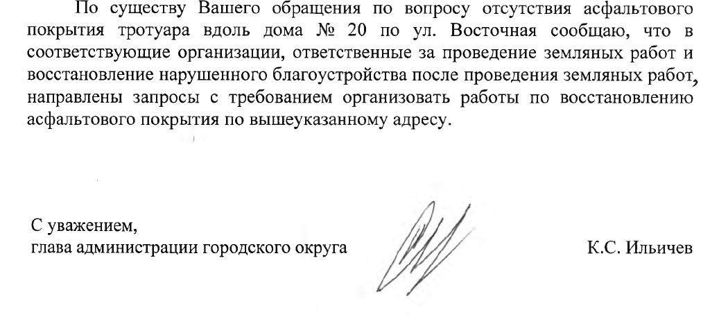 Ирина Александровна, у меня на ул. Восточной дом 20 живёт бабушка ей 82 года . она редко выходит на улицу. Но когда мы всё же выходим на прогулку, то дальше 2 метров от подъезда идти не куда. Ладно что после древних раскопок вы там не чего не вернули на место, но пожалуйста пройдитесь там хоть грейдером. А так же в апреле от администрации был получен ответ ,который прилагаю , у меня возник вопрос: Соответствующие организации,ответственные за провидение земляных работ - это Ваша организация ? Были ли от администрации городского округа какие либо запросы с требованием организовать работы по вышеуказанному адресу ? Благодарю, за ответ за ранее ! -------------------- http://vk.com/avtosalda дороги города и многое другое !