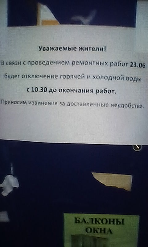 добрый вечер.Ирина Александровна.почему я из сайта узнала про отключение горячей воды с 25 июня по 2 июля??где объявление??